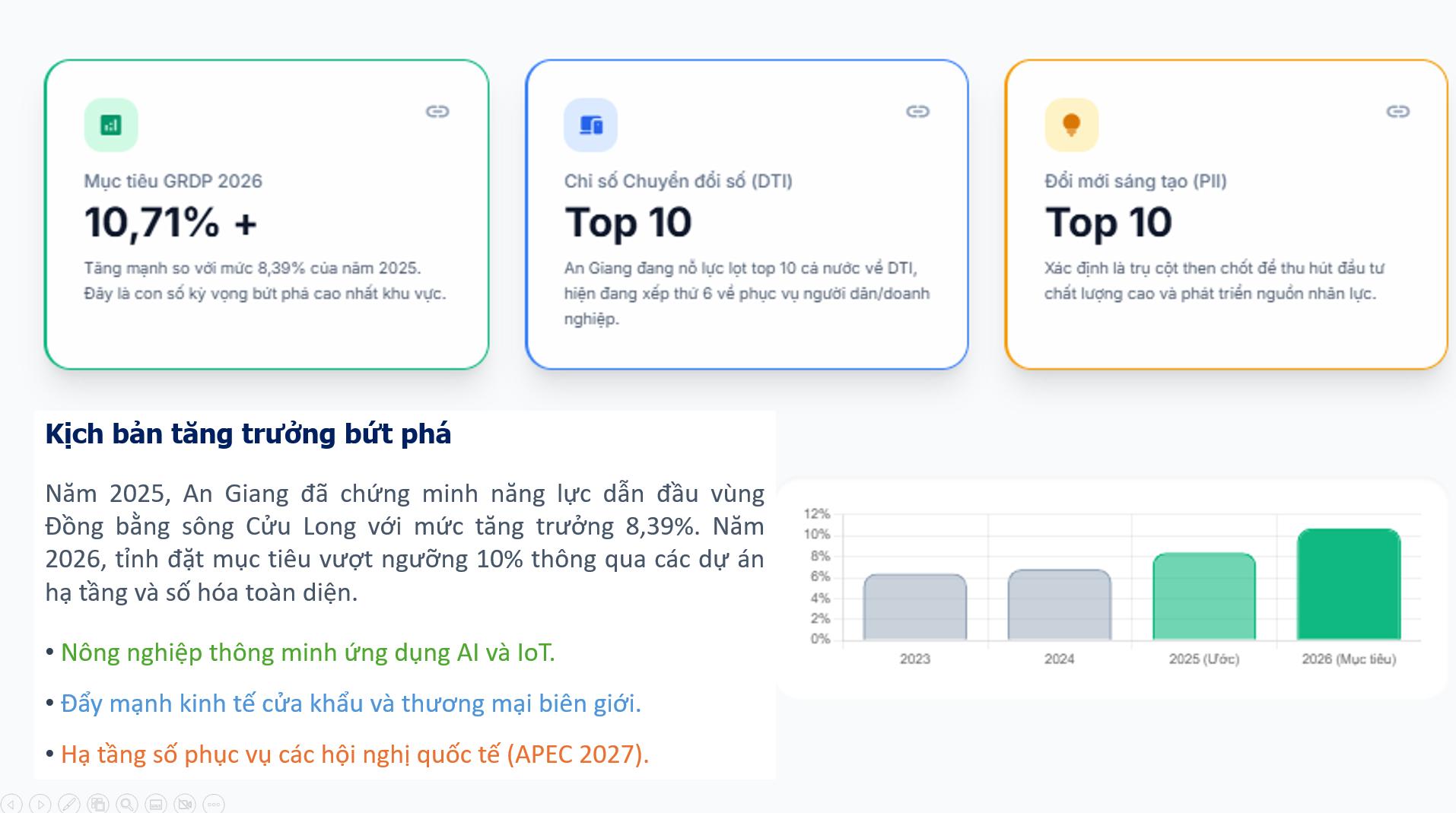 Mục tiêu tăng trưởng GRDP đạt 10,71% năm 2026 là khát vọng lớn, nhưng hoàn toàn khả thi nếu An Giang khai thác hiệu quả động lực chuyển đổi số và đổi mới sáng tạo. Đây không chỉ là con đường tất yếu trong kỷ nguyên công nghệ số mà còn là yếu tố quyết định khả năng cạnh tranh, phát triển bền vững của tỉnh trong dài hạn. Nếu chuyển đổi số được triển khai đồng bộ, toàn diện, An Giang sẽ nhanh chóng thu hẹp khoảng cách với các tỉnh phát triển, vươn lên trở thành trung tâm động lực mới của vùng Đồng bằng sông Cửu Long như mong muốn. Các chỉ số DTI, PII lọt top 10 cả nước sẽ là minh chứng cho nỗ lực này, mở ra cơ hội thu hút đầu tư, phát triển nguồn nhân lực chất lượng cao. Với tinh thần đổi mới, sáng tạo và quyết tâm chính trị mạnh mẽ, đội ngũ cán bộ, công chức, viên chức cùng cộng đồng doanh nghiệp và người dân An Giang cần chung tay thực hiện chuyển đổi số, biến thách thức thành cơ hội, góp phần hiện thực hóa mục tiêu phát triển kinh tế - xã hội năm 2026 và những năm tiếp theo./.
