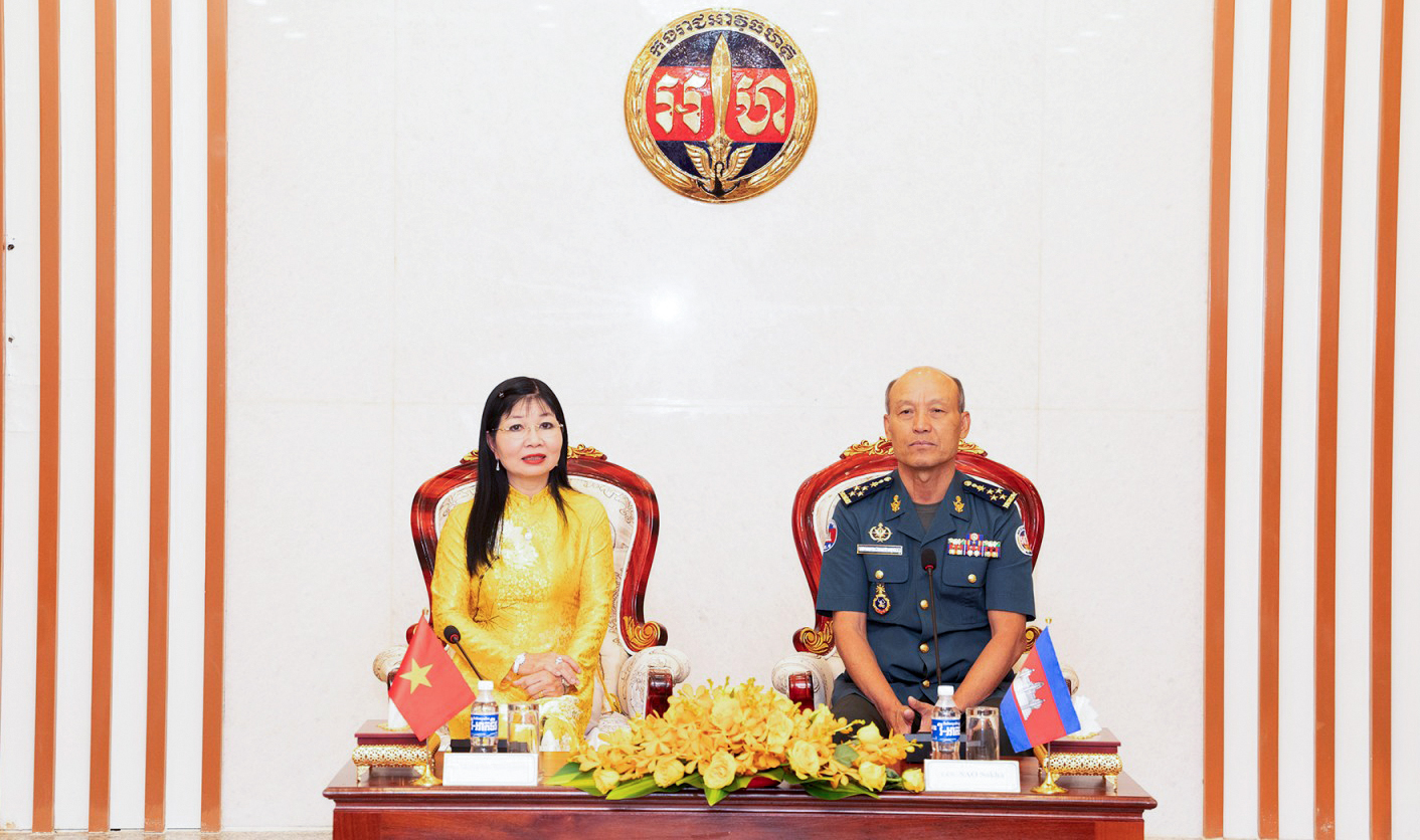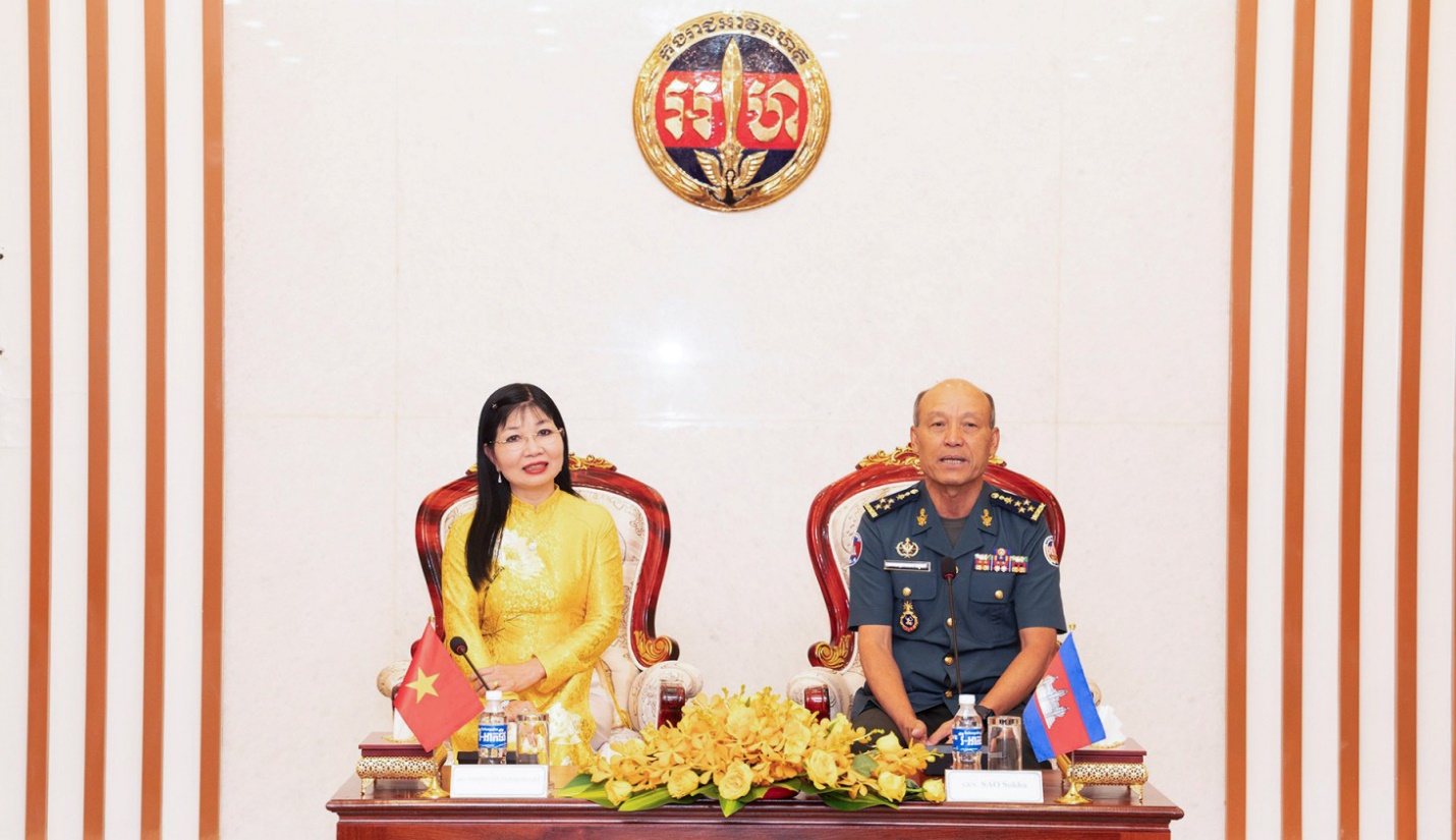 (Cổng TTĐT tỉnh AG)- Chiều 01/4, Đoàn Đại biểu Tỉnh ủy An Giang do Phó Bí thư Tỉnh ủy, Chủ tịch Ủy ban MTTQ Việt Nam tỉnh An Giang Trần Thị Thanh Hương làm trưởng đoàn đến thăm và chúc Tết Chôl Chnăm Thmây năm 2026 tại Bộ Tư lệnh Hiến binh - Quân đội Hoàng gia Campuchia. Đại tướng Sao Sokha, Tư lệnh Bộ Tư lệnh Hiến binh - Quân đội Hoàng gia Campuchia tiếp đoàn.