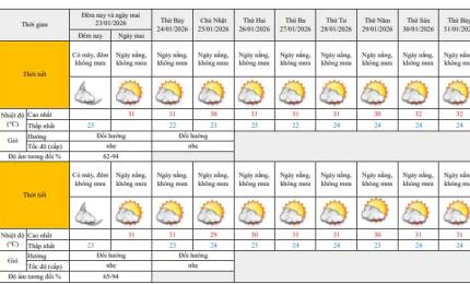 aA Thời tiết Dự báo thời tiết đêm nay và ngày mai 23/01/2026 22/01/2026, 16:26 Xem chi tiết Bản tin Dự báo thời tiết Đài Khí tượng thủy văn tỉnh An Giang (166.76 KB) Quay về Chia sẻ Copy link thành công Bài viết cùng chuyên mục Dự báo thời tiết điểm 10 ngày tới tại An Giang Thời tiết Thông Báo 22/01/2026 Dự báo thời tiết điểm 10 ngày tới tại An Giang Thời tiết 19/01/2026 Dự báo thời tiết đêm nay và ngày mai 20/01/2026 Thời tiết 19/01/2026 Dự báo thời tiết điểm 10 ngày tới tại An Giang Thời tiết 16/01/2026 Dự báo thời tiết đêm nay và ngày mai 17/01/2026 Thời tiết 16/01/2026 Bản tin dự báo, cảnh báo thủy văn thời hạn ngắn tỉnh An Giang Thời tiết Thủy văn - Mực nước 14/01/2026 Bản tin dự báo thời tiết tại An Giang Thời tiết 12/01/2026 Dự báo thời tiết điểm 10 ngày tới tại An Giang Thời tiết 12/01/2026 Bản tin dự báo thời tiết tại An Giang Thời tiết 09/01/2026 Dự báo thời tiết điểm 10 ngày tới tại An Giang Thời tiết 09/01/2026 /vi/du-bao-thoi-tiet-dem-nay-va-ngay-mai-23012026