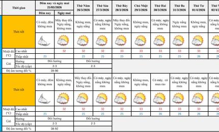 aA Thời tiết - Thủy văn mực nước Dự báo thời tiết đêm nay và ngày mai 25/03/2026 24/03/2026, 16:59 Xem chi tiết Dự báo thời tiết đêm nay và ngày mai 25/03/2026 (245.53 KB) Quay về Chia sẻ Copy link thành công Bài viết cùng chuyên mục Dự báo thời tiết điểm 10 ngày tới tại An Giang Thời tiết - Thủy văn mực nước Thông Báo 24/03/2026 Tin dự báo, cảnh báo thuỷ văn thời hạn ngắn tỉnh An Giang Thời tiết - Thủy văn mực nước 24/03/2026 Dự báo thời tiết điểm 10 ngày tới tại An Giang Thời tiết - Thủy văn mực nước 23/03/2026 Tin dự báo, cảnh báo thuỷ văn thời hạn ngắn tỉnh An Giang Thời tiết - Thủy văn mực nước 23/03/2026 Tin dự báo, cảnh báo thuỷ văn thời hạn ngắn tỉnh An Giang Thời tiết - Thủy văn mực nước 19/03/2026 Dự báo thời tiết điểm 10 ngày tới tại An Giang Thời tiết - Thủy văn mực nước 18/03/2026 Dự báo thời tiết đêm nay 18/3/2026 và ngày mai Thời tiết - Thủy văn mực nước 18/03/2026 Tin dự báo, cảnh báo thuỷ văn thời hạn ngắn tỉnh An Giang Thời tiết - Thủy văn mực nước 18/03/2026 Dự báo thời tiết đêm nay và ngày mai 18/03/2026 Thời tiết - Thủy văn mực nước 17/03/2026 Tin dự báo, cảnh báo thuỷ văn thời hạn ngắn tỉnh An Giang Thời tiết - Thủy văn mực nước 17/03/2026 /vi/du-bao-thoi-tiet-dem-nay-va-ngay-mai-25032026
