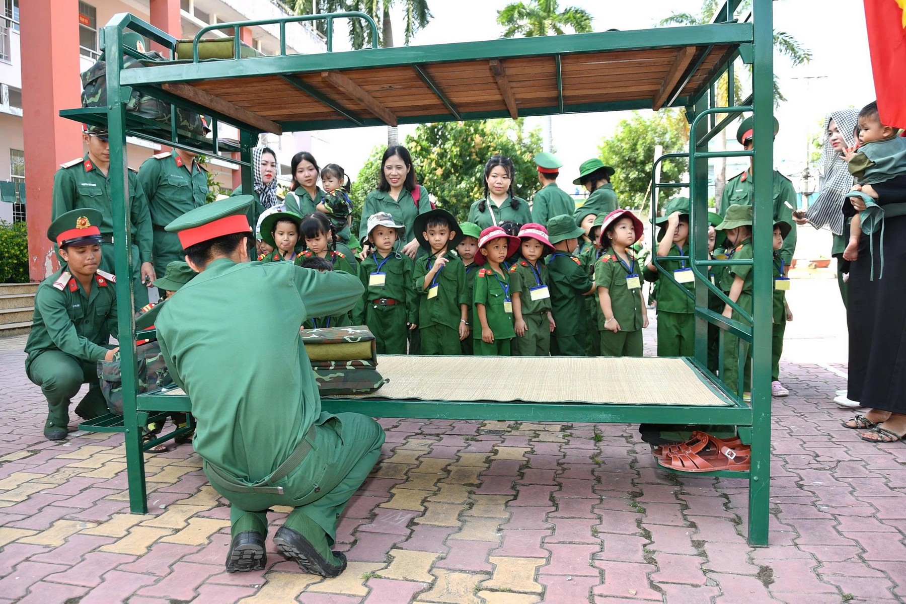 Bên cạnh đó, các cháu còn được các cô, chú bộ đội trực tiếp hướng dẫn tham quan Nhà truyền thống của đơn vị – nơi lưu giữ nhiều hình ảnh, hiện vật quý giá phản ánh chặng đường 81 năm xây dựng, chiến đấu và trưởng thành vẻ vang của Quân đội nhân dân Việt Nam, cũng như truyền thống anh hùng của lực lượng vũ trang tỉnh An Giang. Các cháu còn được tìm hiểu thực tế về nơi ăn, nghỉ, sinh hoạt, học tập của cán bộ, chiến sĩ; tham quan các phương tiện, trang bị quân sự, trong đó có xe thiết giáp; chụp ảnh lưu niệm, ghi lại những kỷ niệm đáng nhớ cùng các cô, chú bộ đội.