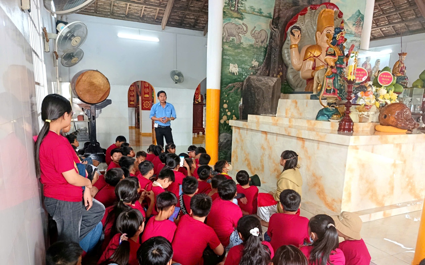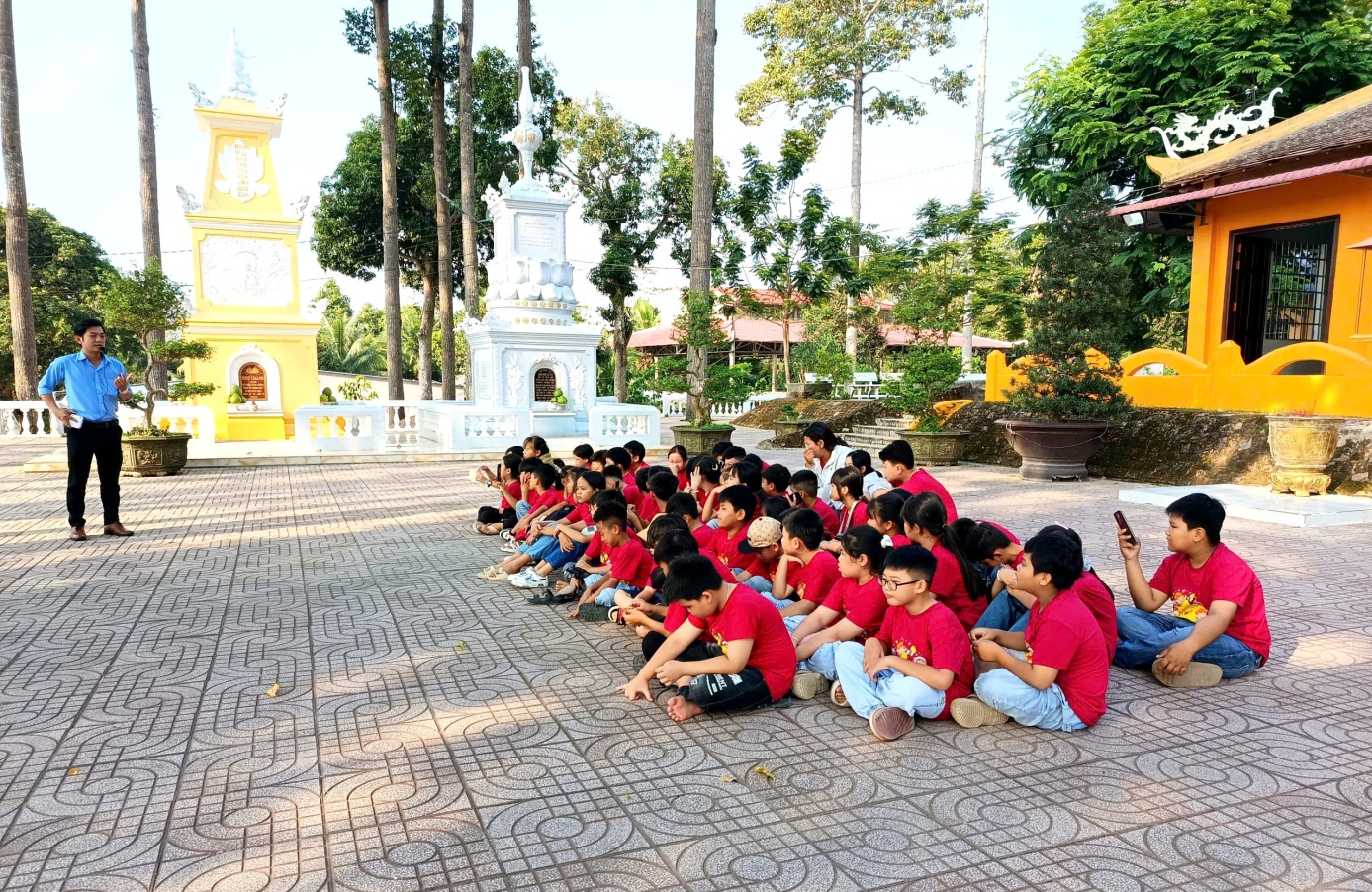 Tiếp nối hành trình, đoàn đã đến dâng hương và tham quan di tích tại Chùa Linh Sơn cổ tự, di tích Gò Cây Thị, các “nhà khảo cổ nhí” đã có cơ hội tìm hiểu về kiến trúc đền tháp độc đáo của cư dân Óc Eo xưa.