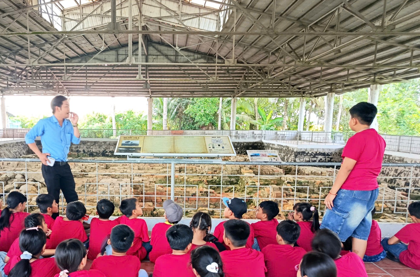 Dưới sự hướng dẫn tận tình của các thuyết minh viên, các em học sinh đã chăm chú lắng nghe những câu chuyện về phong tục tập quán và sự phát triển hưng thịnh của vương quốc Phù Nam xưa. Không chỉ dừng lại ở việc quan sát, nhiều em còn chủ động đặt câu hỏi, tìm hiểu ý nghĩa của các biểu tượng trên văn bia đá. Những ánh mắt tò mò cùng những thảo luận sôi nổi về các dấu tích khảo cổ đã cho thấy tinh thần ham học hỏi và sự trân trọng đặc biệt mà thế hệ trẻ dành cho những giá trị tinh hoa của tiền nhân để lại.