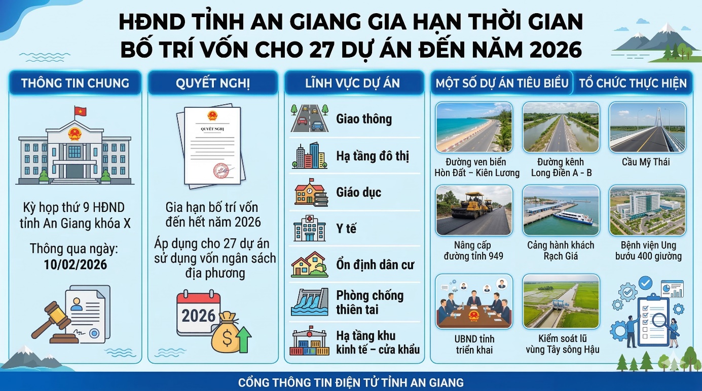 (Cổng TTĐT tỉnh AG)-Kỳ họp thứ 9, khóa X, Hội đồng nhân dân tỉnh An Giang đã thông qua Nghị quyết gia hạn thời gian bố trí vốn thực hiện dự án đến hết năm 2026 đối với 27 dự án sử dụng vốn ngân sách địa phương. Nghị quyết có hiệu lực kể từ ngày 10/02/2026.