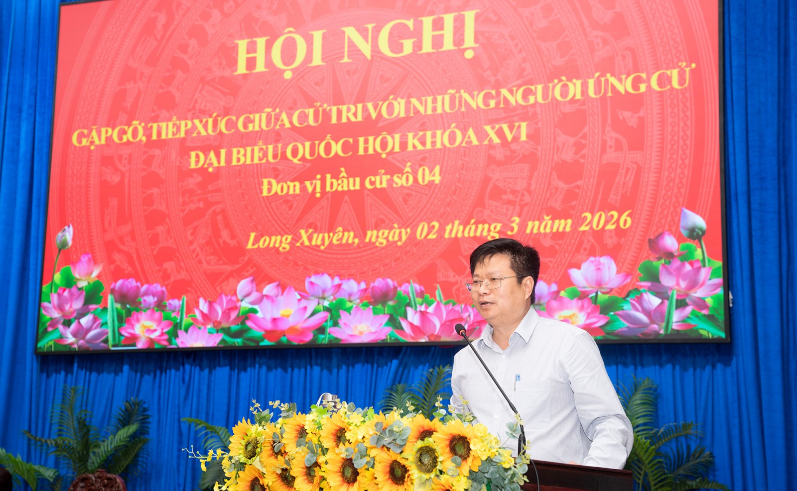 (Cổng TTĐT tỉnh AG)- Sáng 02/3, tại Hội trường Trung tâm Hành chính phường Long Xuyên, Ban Thường trực Ủy ban MTTQ Việt Nam tỉnh tổ chức Hội nghị tiếp xúc cử tri theo hình thức trực tiếp và trực tuyến để các ứng cử viên đại biểu Quốc hội khóa XVI, đơn vị bầu cử số 4 thực hiện vận động bầu cử theo quy định của pháp luật.