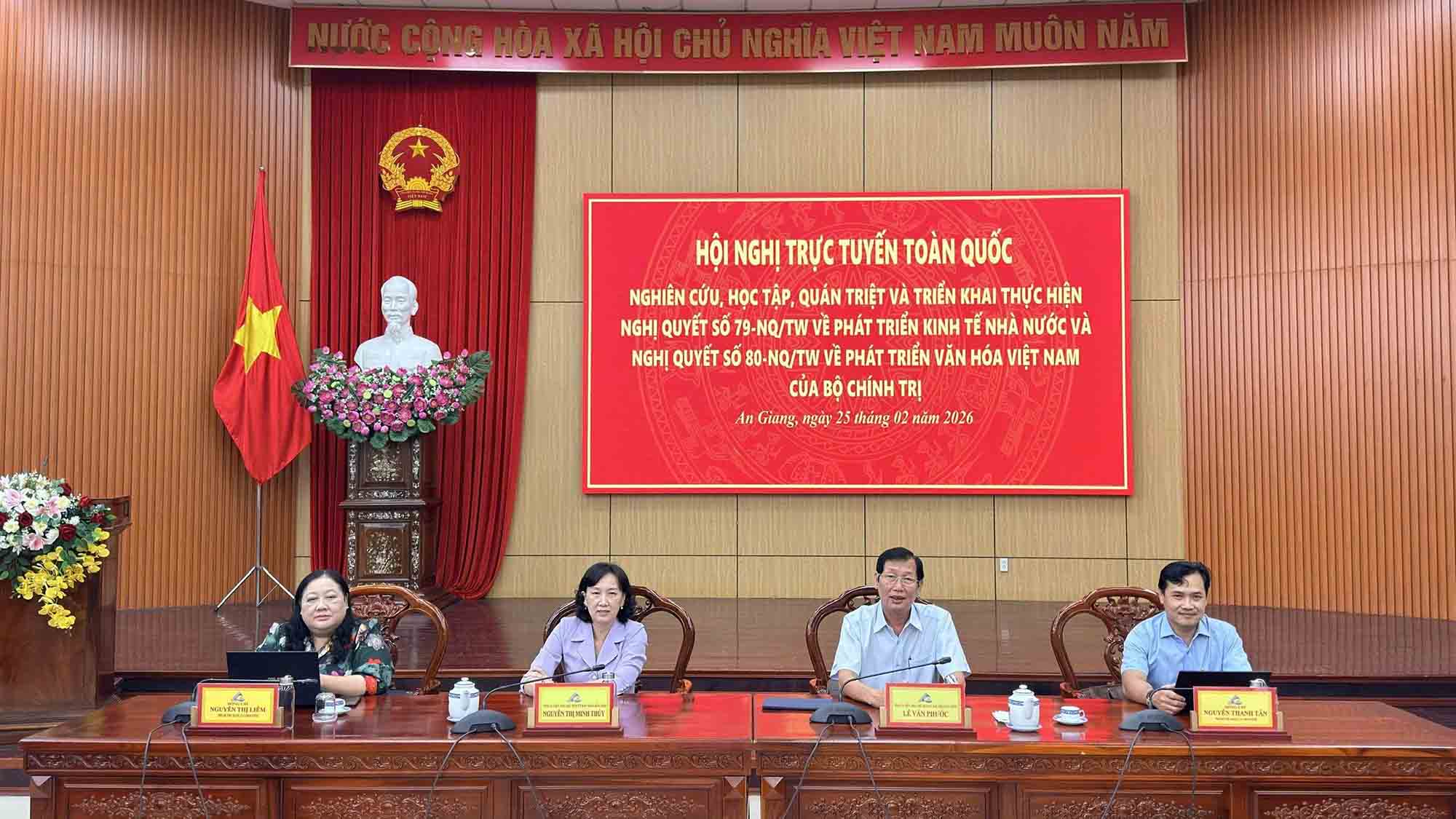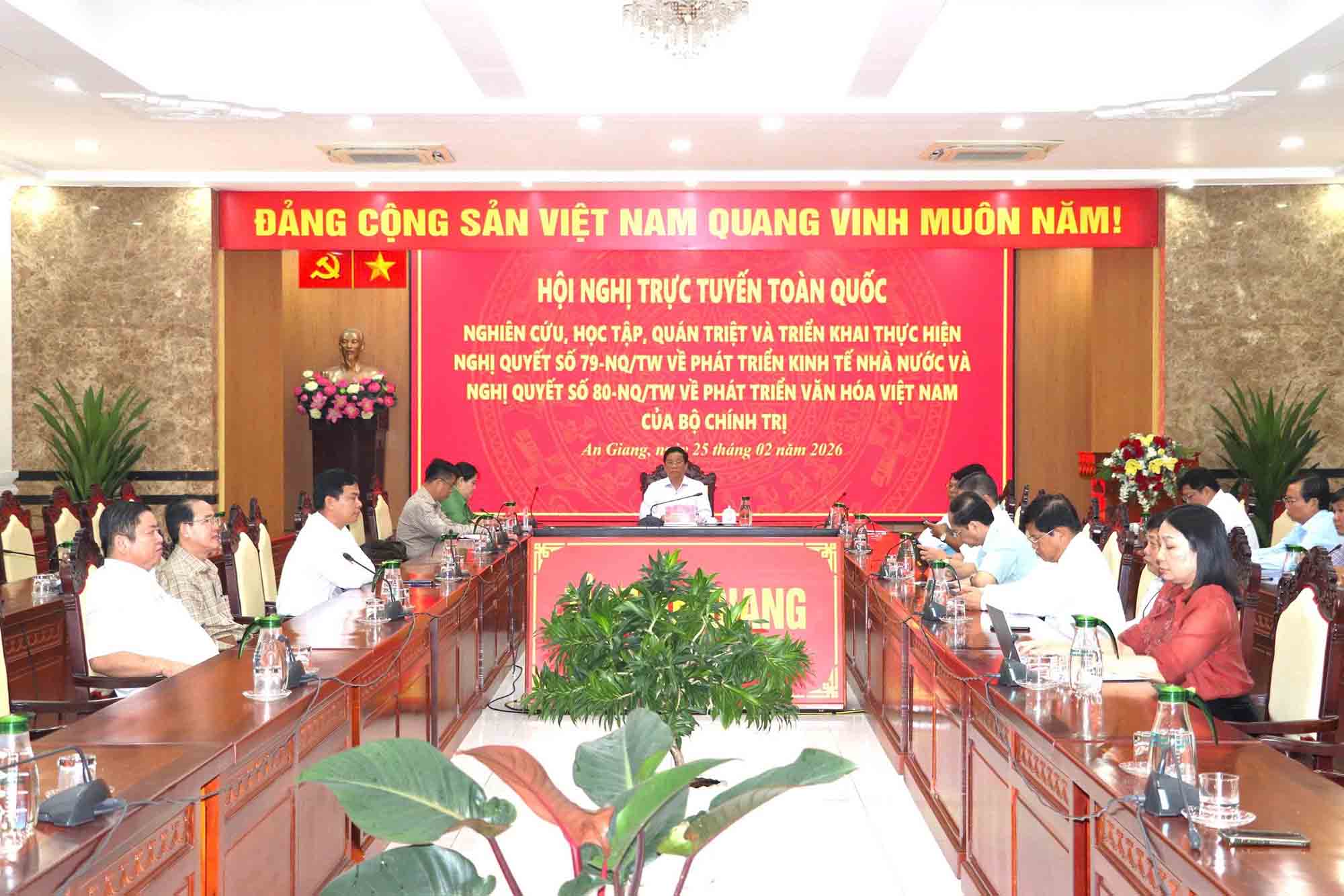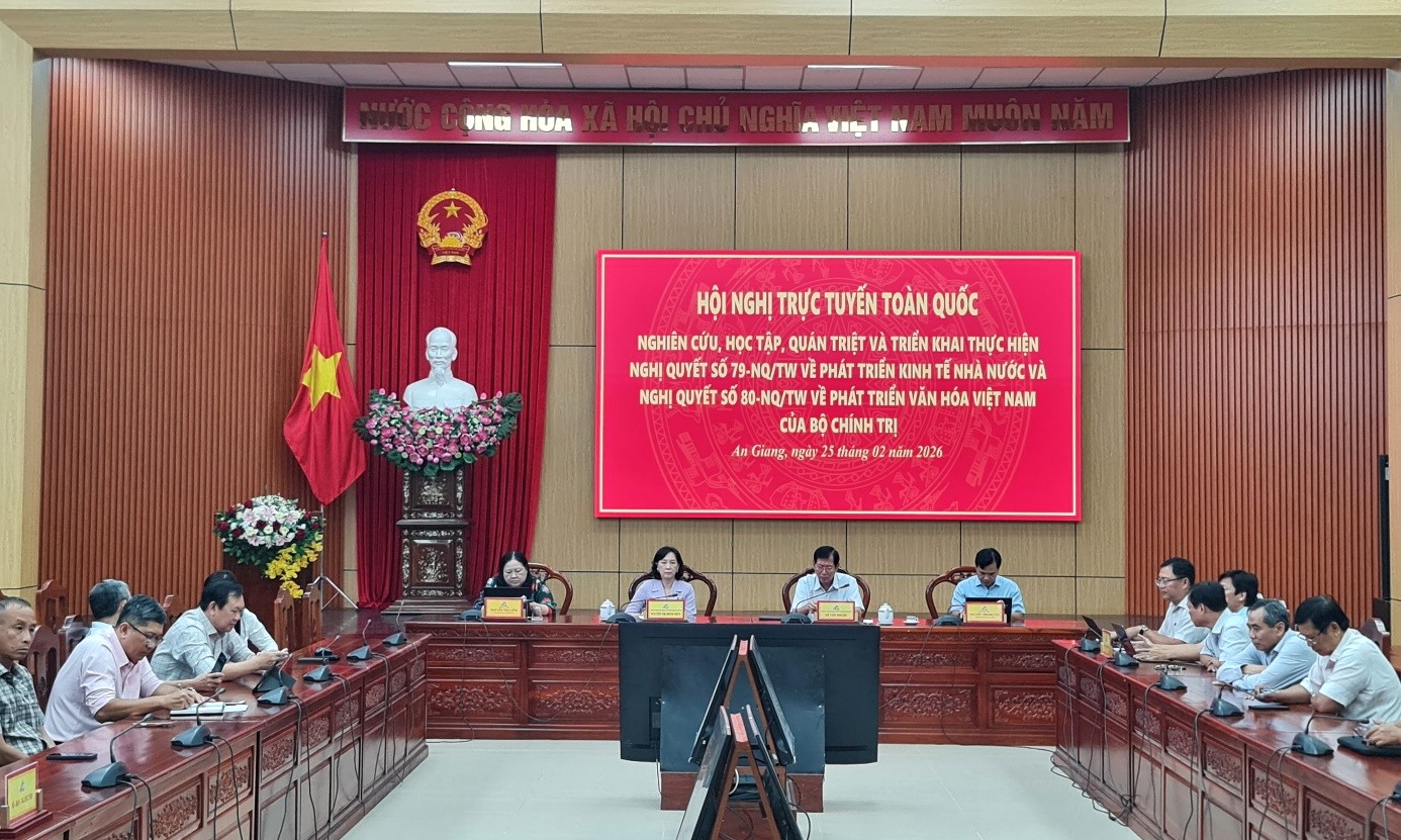 (Cổng TTĐT tỉnh AG)- Sáng 25/02, Ban Thường vụ Tỉnh ủy An Giang chuyển tiếp Hội nghị toàn quốc nghiên cứu, học tập, quán triệt và triển khai thực hiện Nghị quyết số 79-NQ/TW, ngày 06/01/2026 của Bộ Chính trị về phát triển kinh tế nhà nước và Nghị quyết số 80-NQ/TW, ngày 07/01/2026 của Bộ Chính trị về phát triển văn hóa Việt Nam do Ban Bí thư Trung ương Đảng tổ chức.
