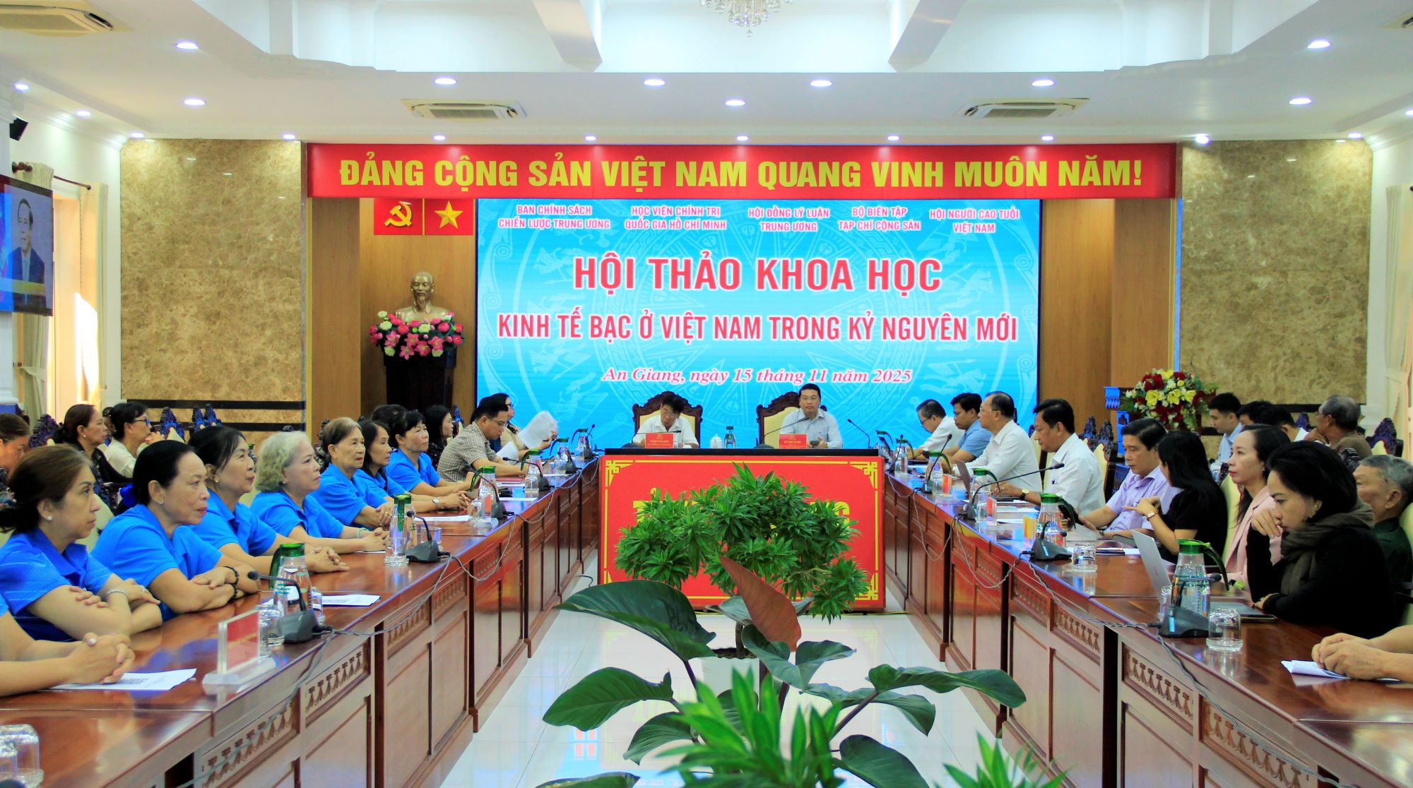 (Cổng TTĐT tỉnh AG) - Sáng ngày 15/11, Trung ương Hội Người cao tuổi Việt Nam và Ban Chính sách, Chiến lược Trung ương; Học viện Chính trị Quốc gia Hồ Chí Minh; Hội đồng Lý luận Trung ương; Tạp chí Cộng sản phối hợp tổ chức Hội thảo Khoa học "Kinh tế bạc ở Việt Nam trong kỷ nguyên mới”. Hội thảo được tổ chức dưới hình thức trực tiếp tại điểm cầu Trung ương và trực tuyến tại 33 điểm cầu Ủy ban nhân dân các tỉnh, thành phố trực thuộc Trung ương.