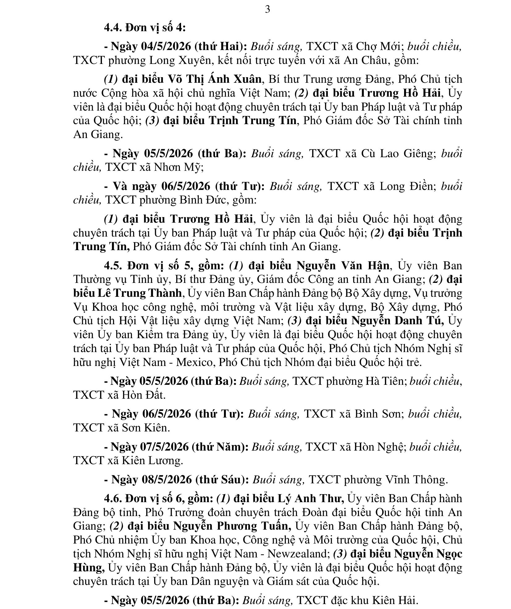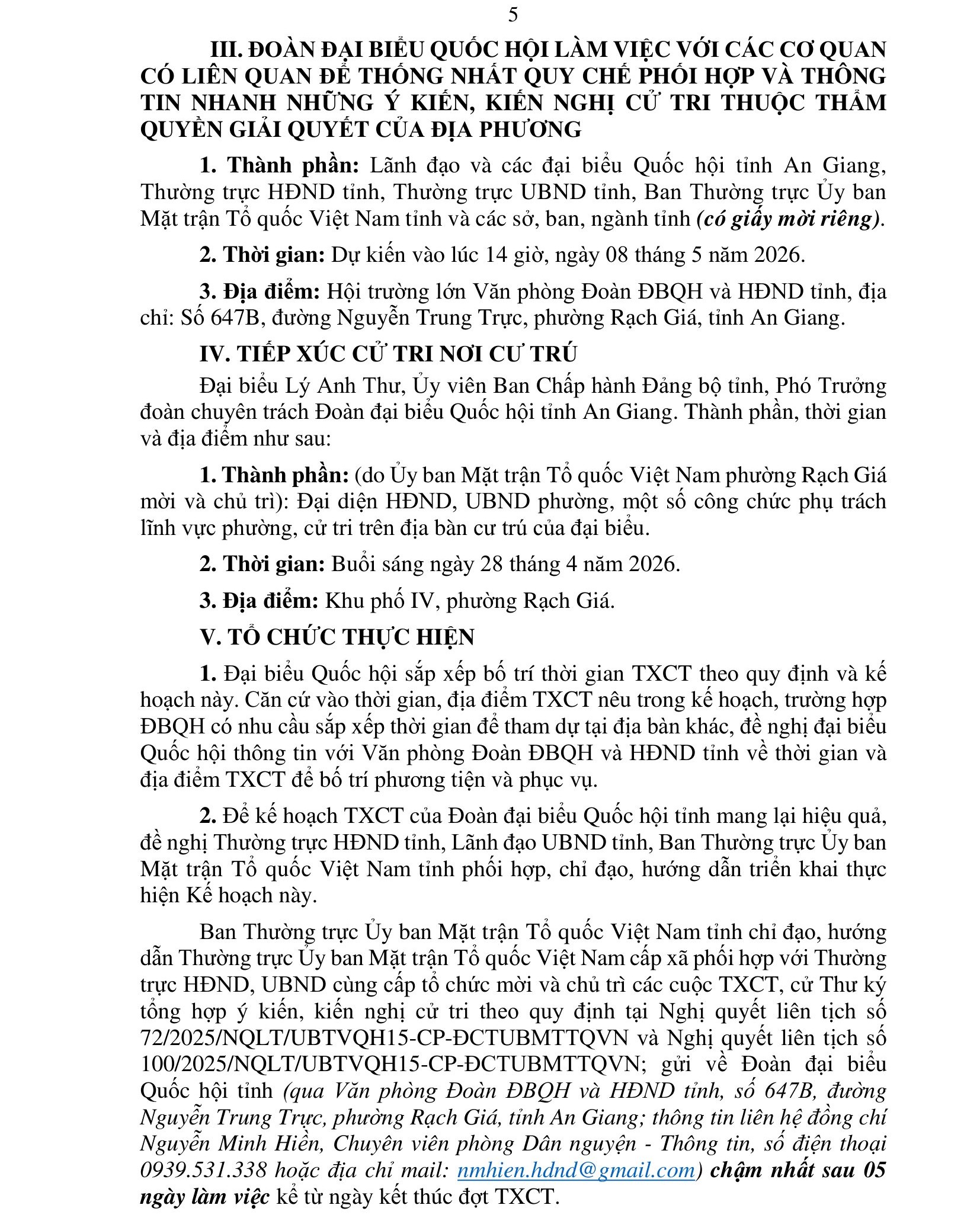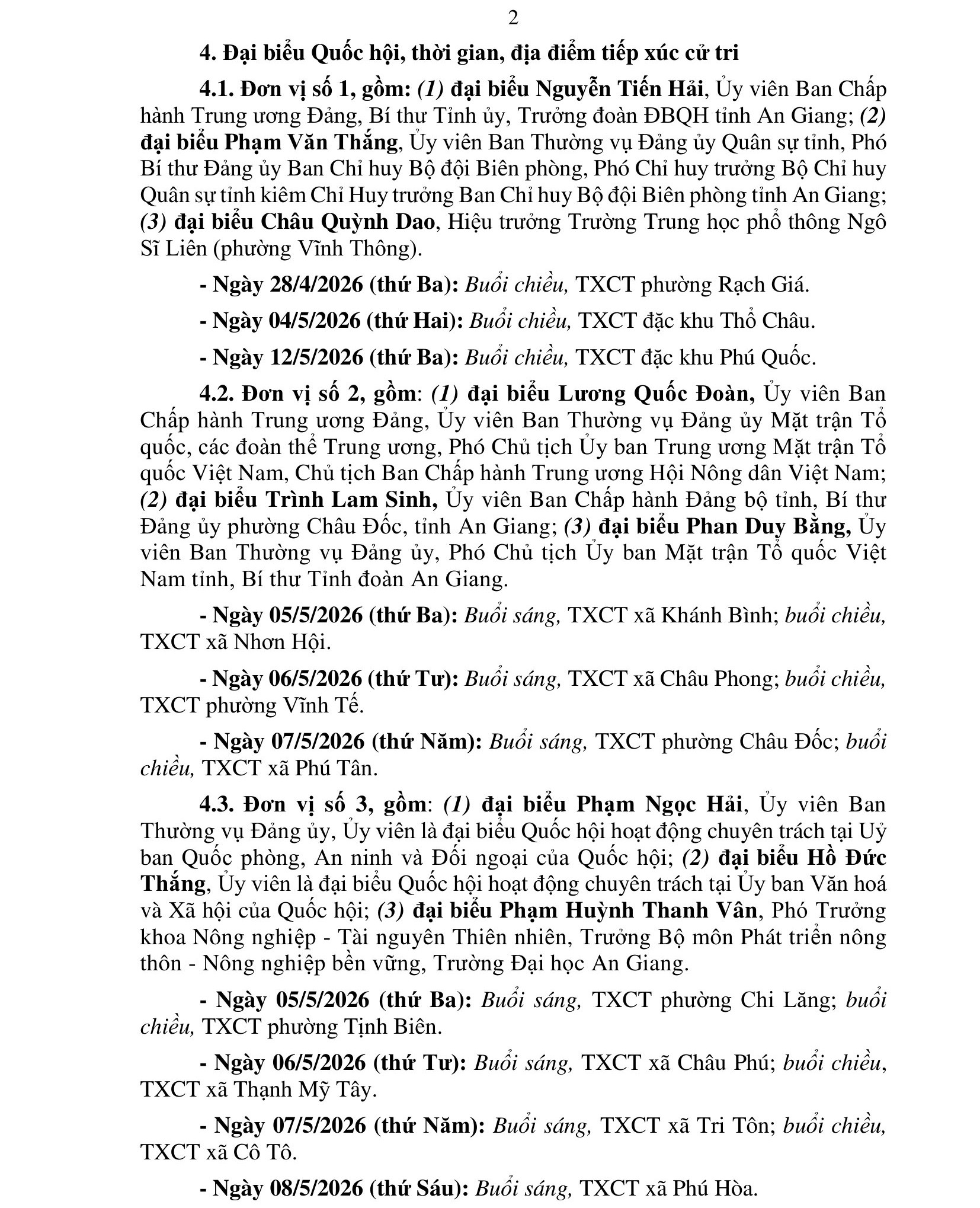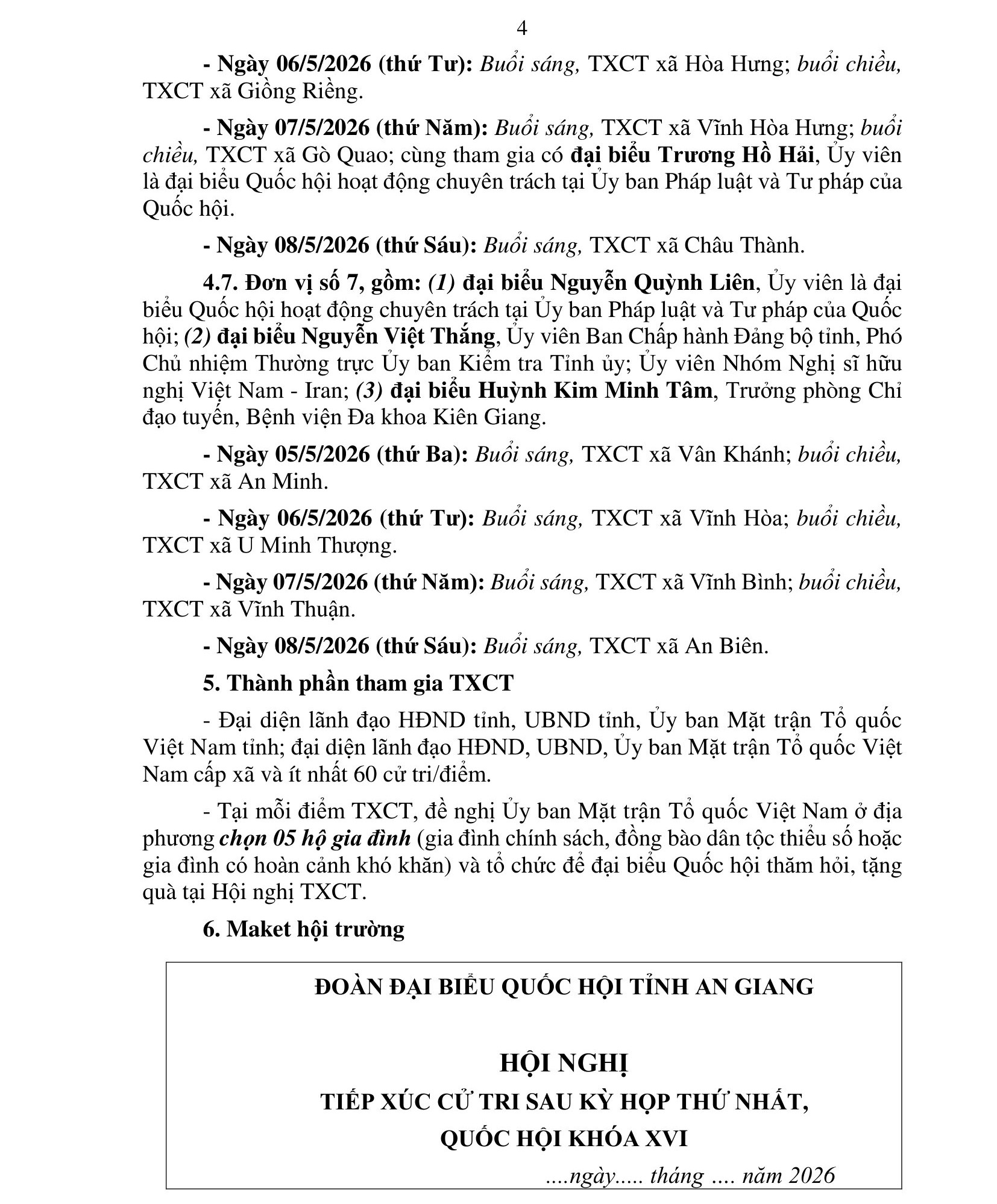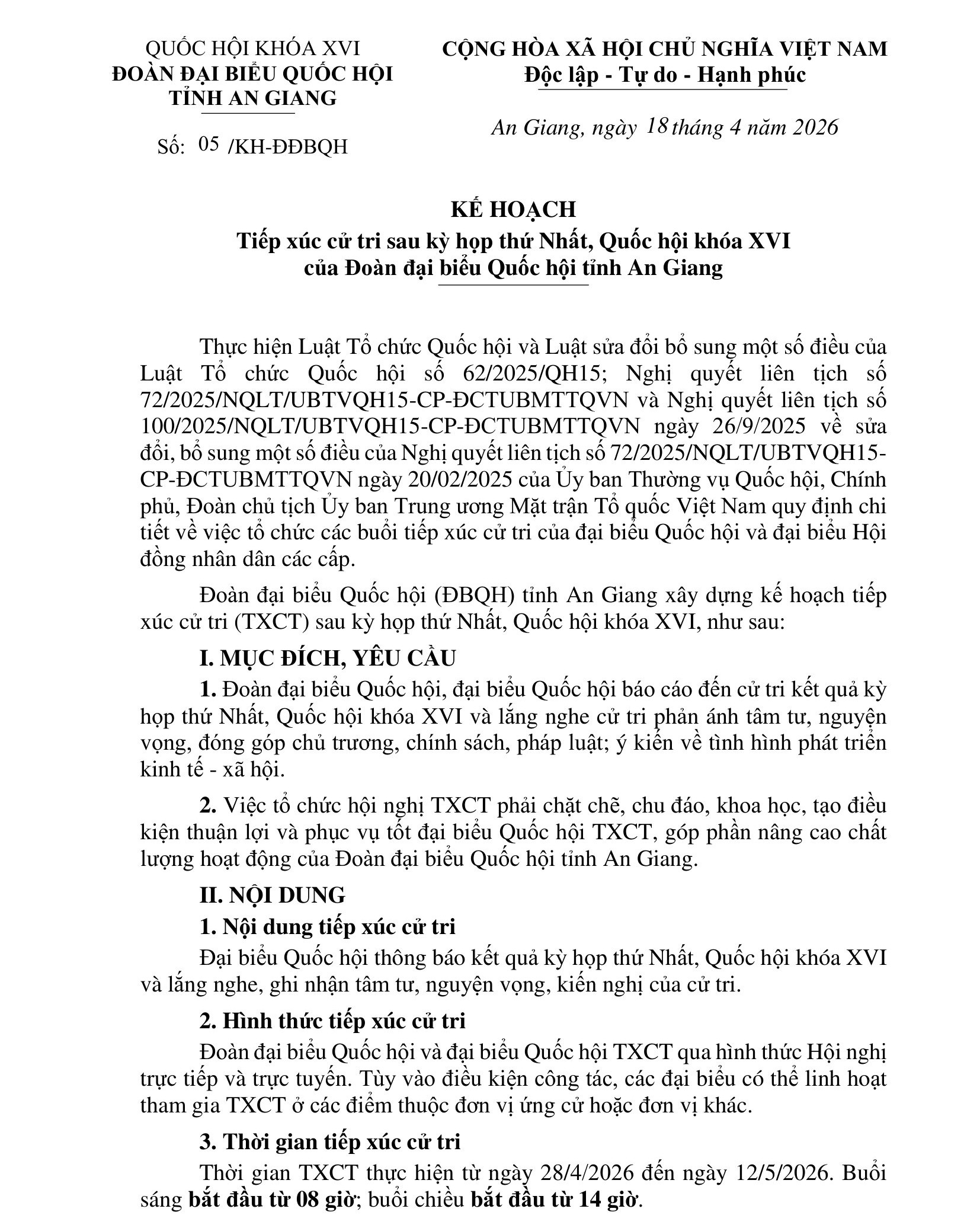 Kế hoạch số: 05/KH-ĐĐBQH, ngày 18 tháng 4 năm 2026 của Đoàn đại biểu Quốc hội tỉnh An Giang, Tiếp xúc cử tri sau kỳ họp thứ Nhất, Quốc hội khóa XVI của Đoàn đại biểu Quốc hội tỉnh An Giang.