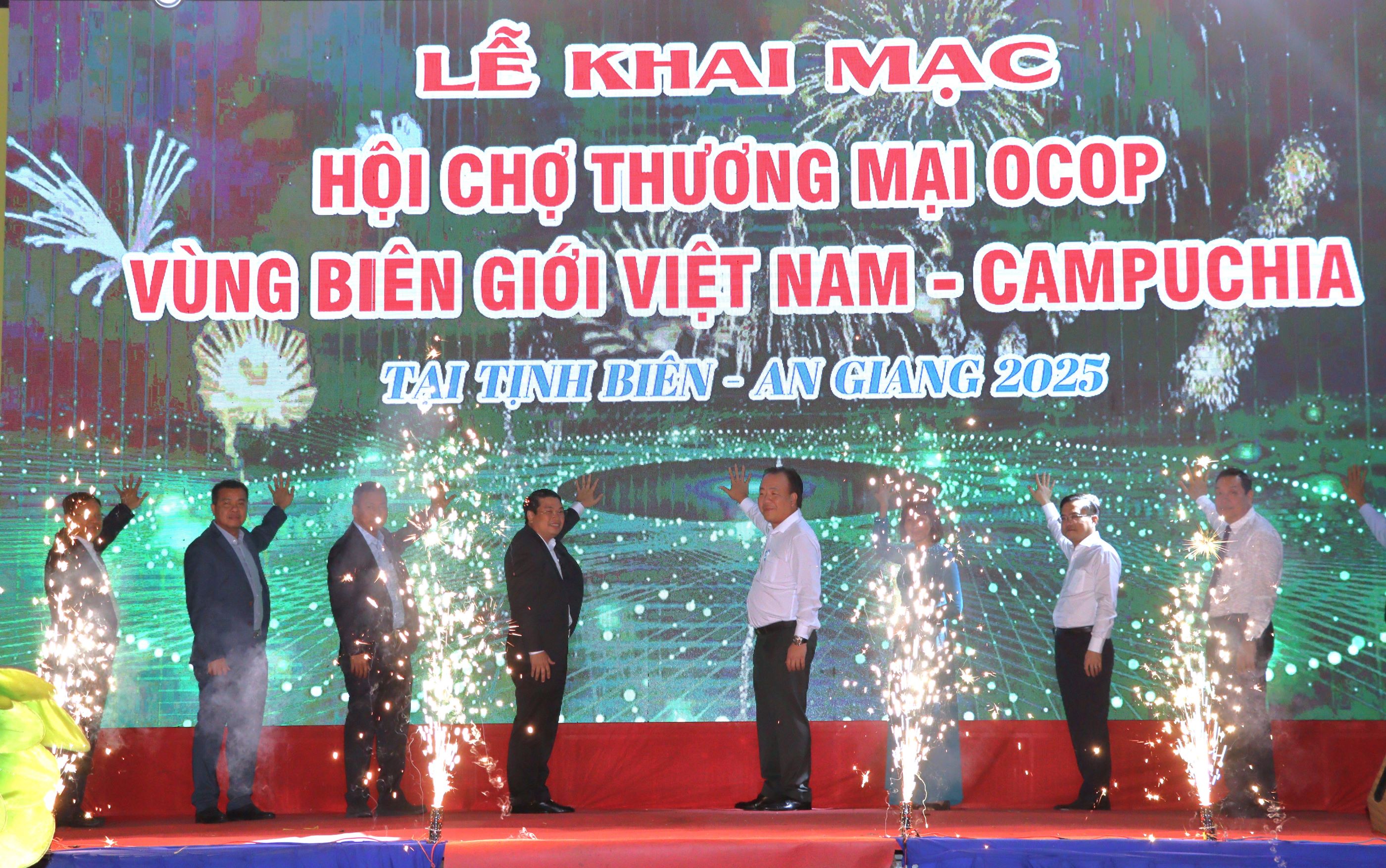(Cổng TTĐT tỉnh AG) - Tối 10/12, tại Khu công nghiệp Xuân Tô (phường Tịnh Biên), Bộ Công Thương và UBND tỉnh An Giang phối hợp tổ chức Hội chợ Thương mại OCOP vùng biên giới Việt Nam – Campuchia. Đây là sự kiện có ý nghĩa quan trọng trong phát triển kinh tế, thúc đẩy liên kết vùng, tăng cường giao thương hữu nghị hợp tác giữa hai nước láng giềng.