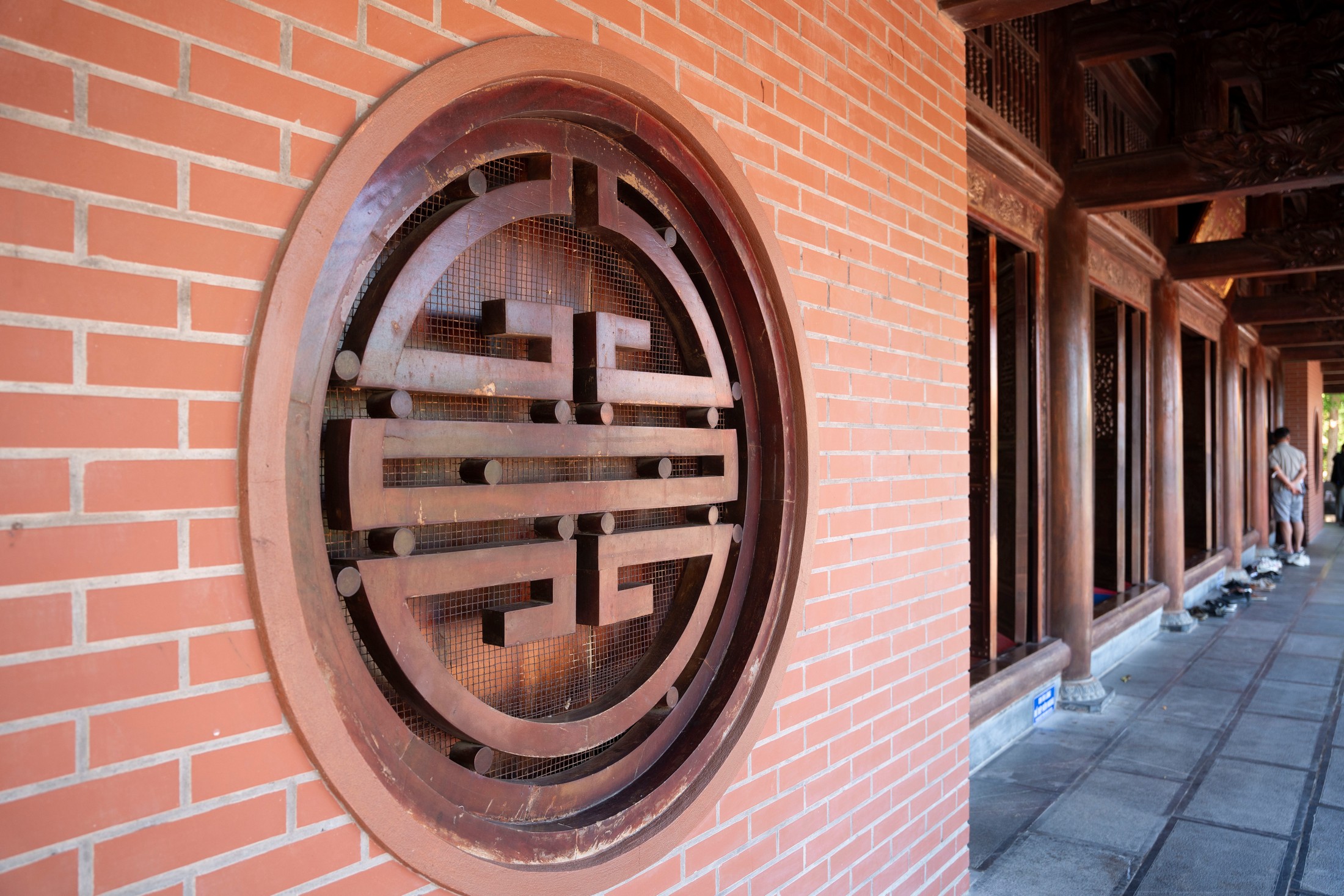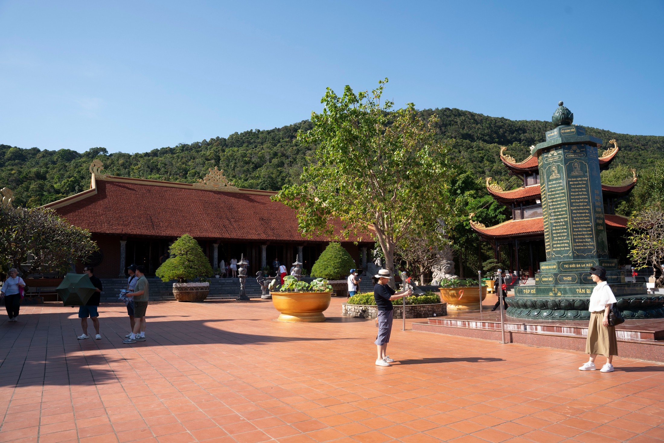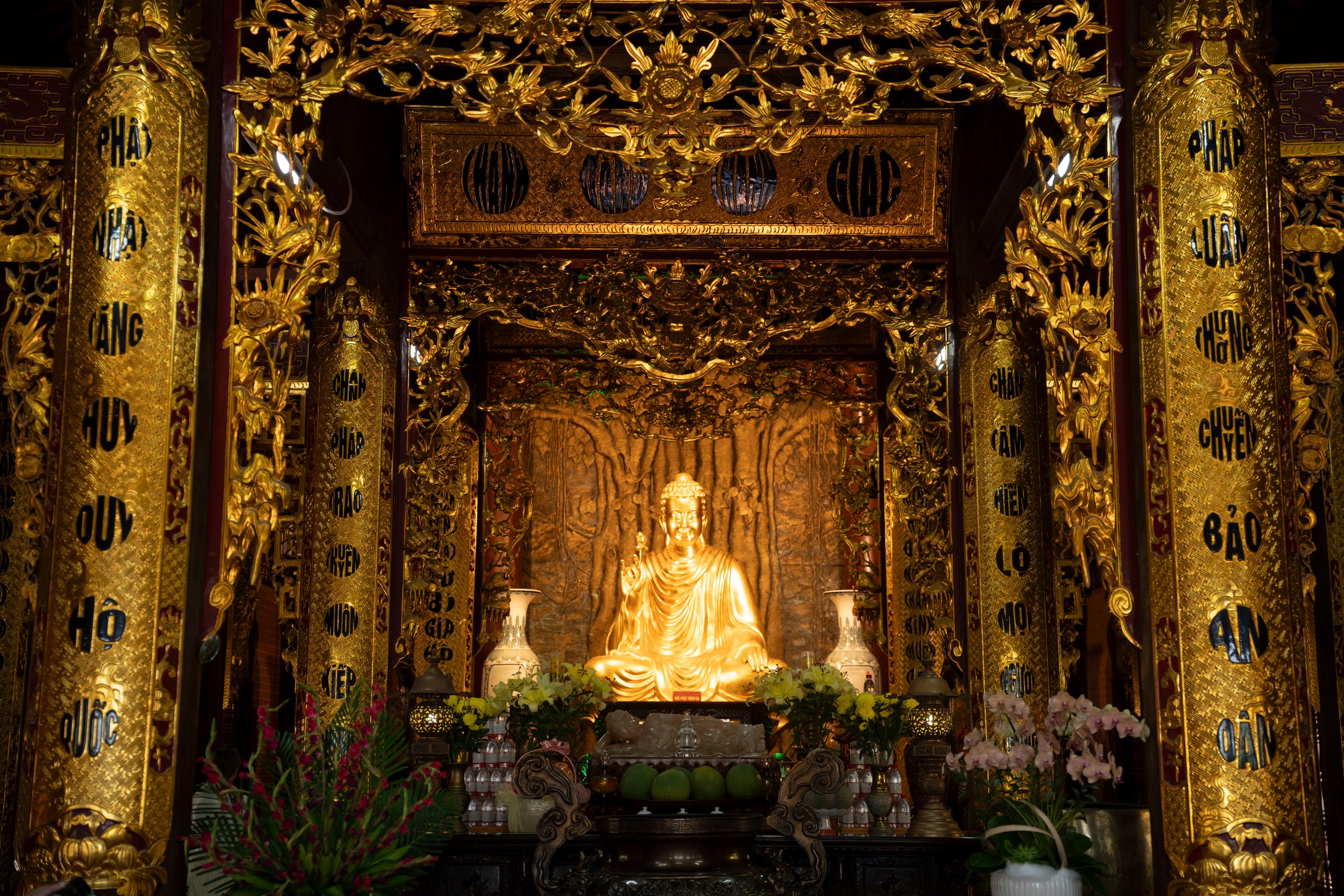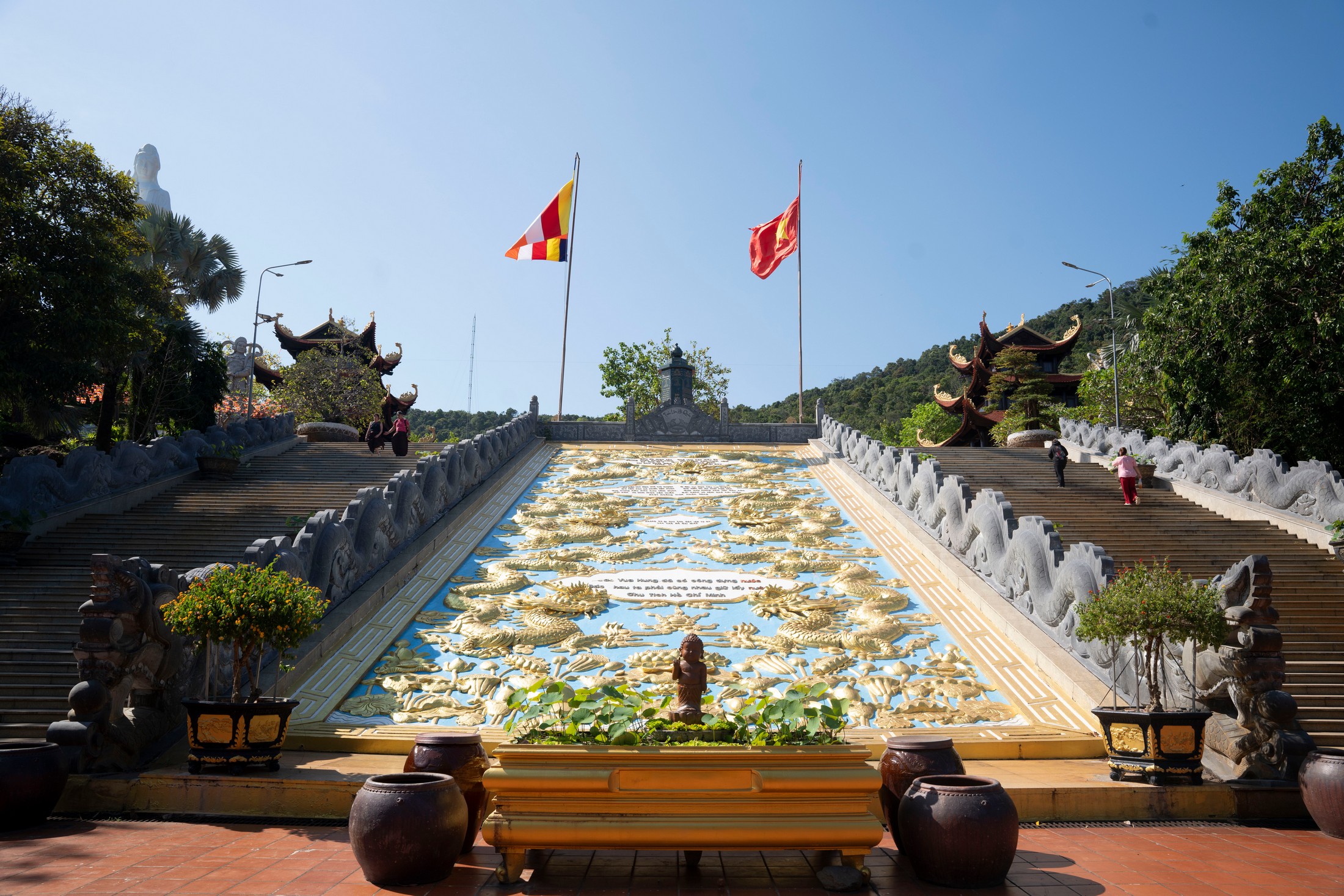 Từ cổng chính lên chánh điện, du khách sẽ bước qua 70 bậc đá hai bên bức phù điêu hình rồng sen màu vàng công phu và hành lang được cách điệu bằng hình những con rồng được điêu khắc.