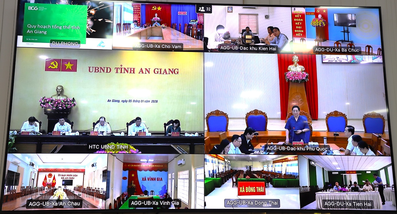(Cổng TTĐT tỉnh AG)- Sáng ngày 05/01, UBND tỉnh An Giang tổ chức cuộc họp để nghe báo cáo việc điều chỉnh Quy hoạch tỉnh thời kỳ 2021 - 2030, tầm nhìn đến năm 2050. Chủ trì cuộc họp tại điểm cầu đặc khu Phú Quốc, do Ủy viên dự khuyết BCH Trung ương Đảng, Phó Bí thư Tỉnh ủy, Chủ tịch UBND tỉnh Hồ Văn Mừng; Lãnh đạo Sở Tài chính; Sở Văn hóa và Thể thao; Lãnh đạo đặc khu Phú Quốc; đơn vị tư vấn Boston Consulting Group (BCG); chuyên gia cùng tham dự.