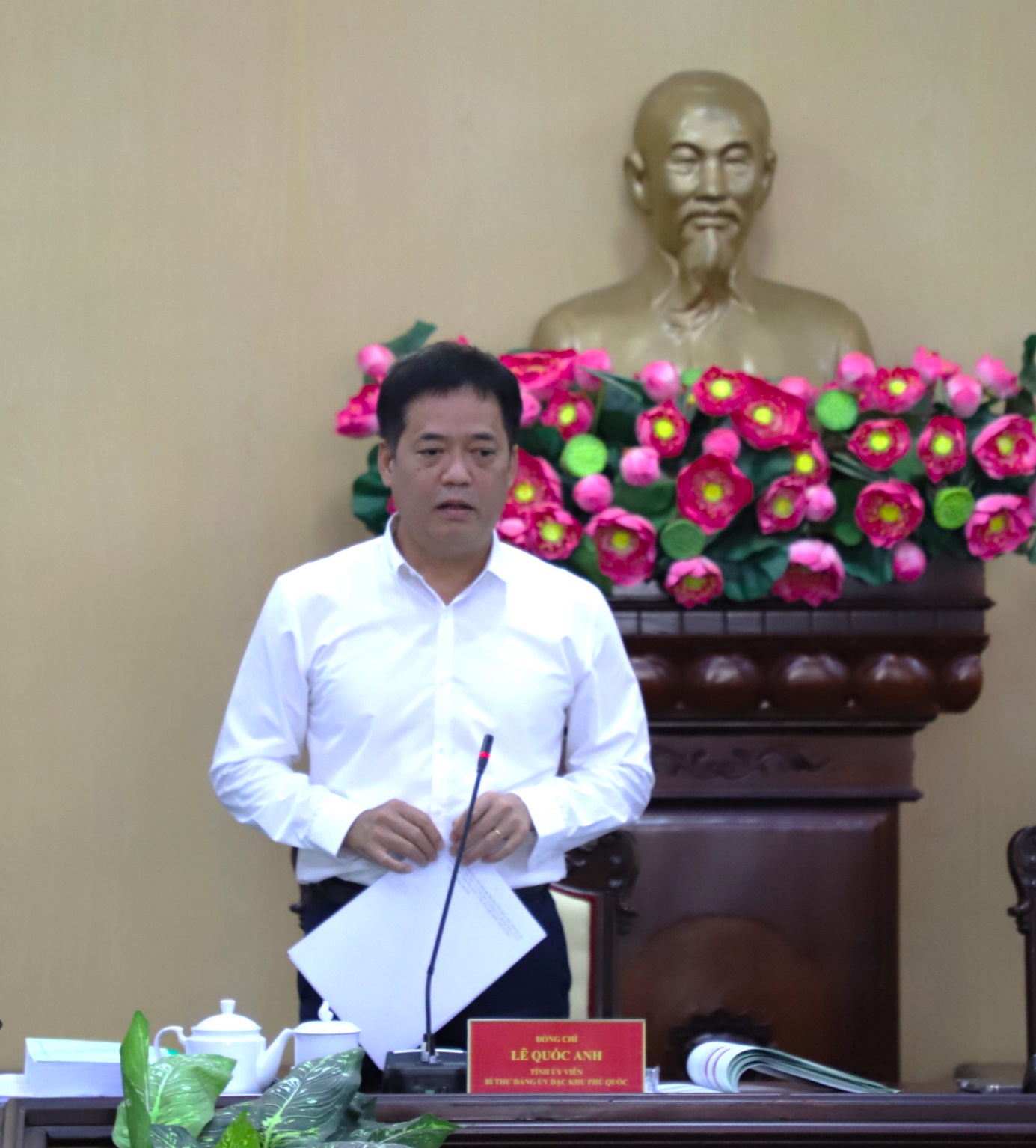 Phát biểu tại cuộc họp, Bí thư đặc khu Phú Quốc Lê Quốc Anh cơ bản thống nhất với việc điều chỉnh Quy hoạch tỉnh thời kỳ 2021 - 2030, tầm nhìn đến năm 2050 của đơn vị tư vấn BCG và ý kiến của chuyên gia. Đối với Quy hoạch của Phú Quốc thì Bí thư Đảng ủy Phú Quốc thống nhất cao với đề xuất của đơn vị tư vấn và chuyên gia đã nêu lên đầy đủ về các lĩnh vực, tuy nhiên, đơn vị tư vấn cần nghiên cứu thêm yếu tố văn hóa của An Giang mới như: Miếu Bà Chúa Sứ, Di tích lịch sử Mạc Cửu, Đền thờ Anh hùng dân tộc Nguyễn Trung Trực,…