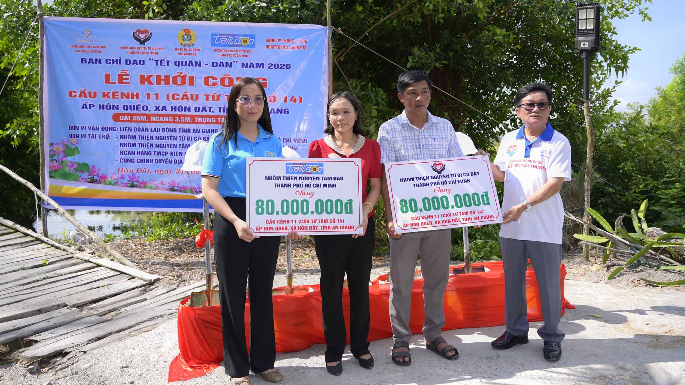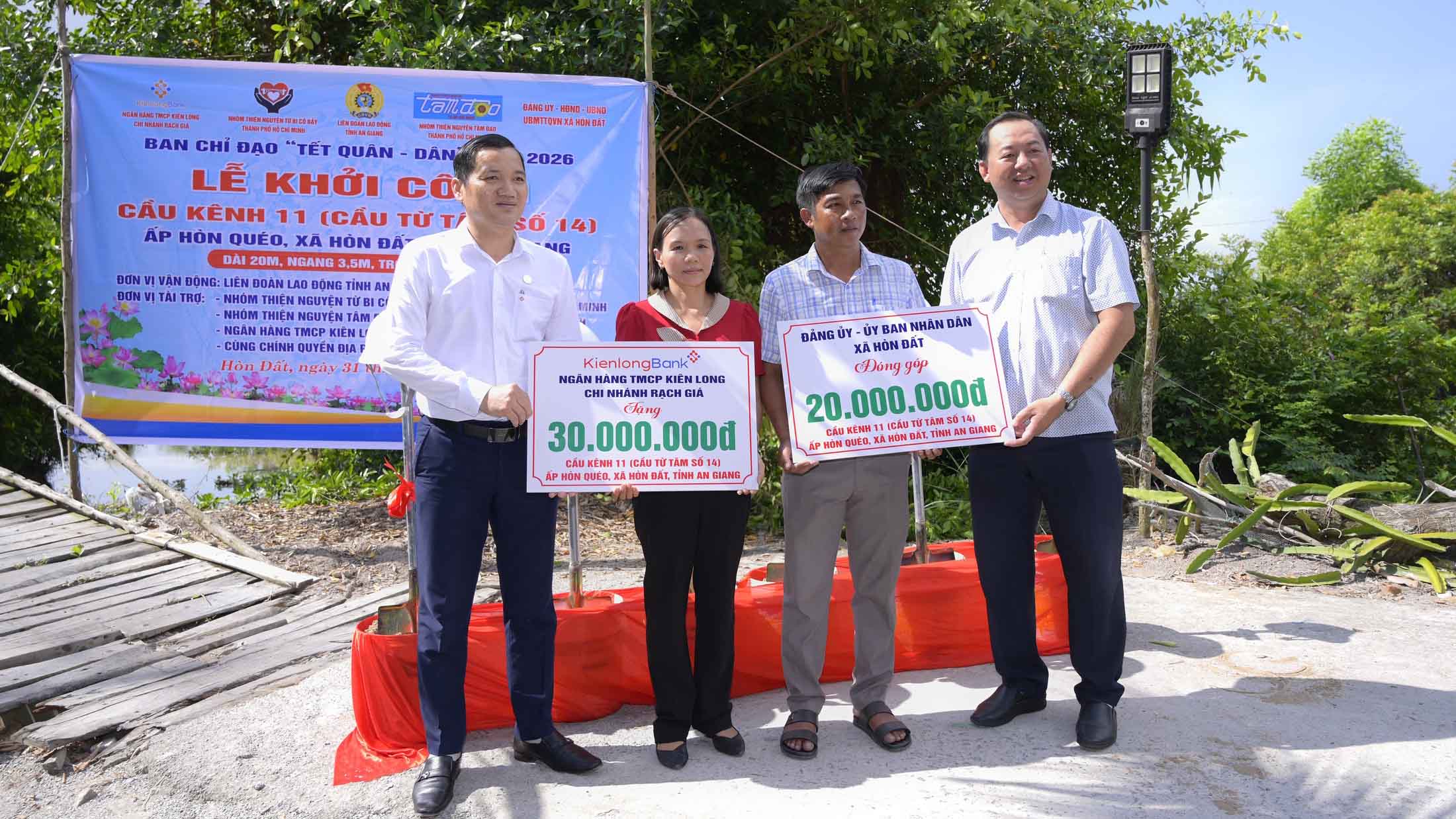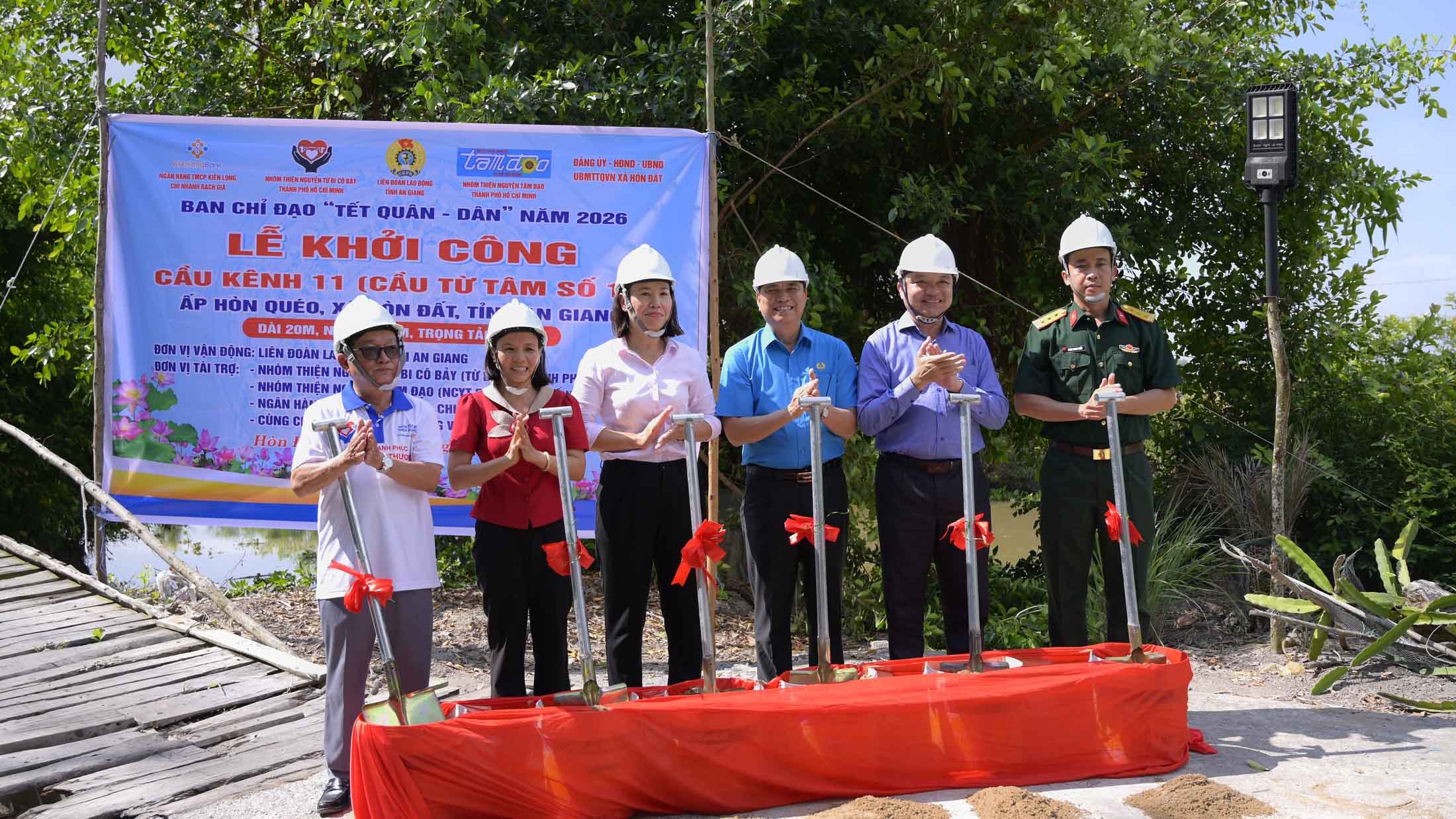 (Cổng TTĐT tỉnh AG)- Sáng 31/3, trong không khí sôi nổi của các hoạt động Tết Quân - Dân mừng Tết Chôl Chnăm Thmây năm 2026, Liên đoàn Lao động tỉnh An Giang phối hợp Ủy ban nhân dân xã Hòn Đất cùng các đơn vị tài trợ tổ chức Lễ khởi công xây dựng cầu Kênh 11, ấp Hòn Quéo.