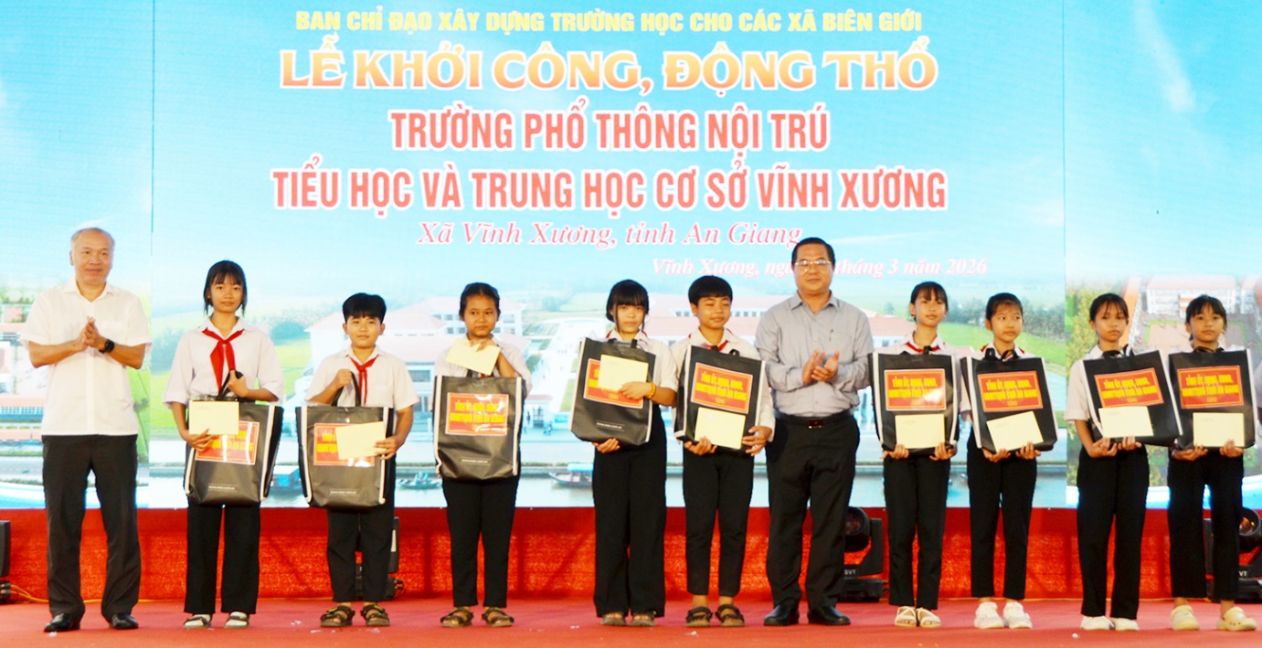 (Cổng TTĐT tỉnh AG) -Sáng 19/3, Bộ Giáo dục và Đào tạo chủ trì, phối hợp Đài Truyền hình Việt Nam, Tập đoàn Bưu chính Viễn thông Việt Nam (VNPT), Tập đoàn Công nghiệp - Viễn thông Quân đội (Viettel) và 17 tỉnh, thành phố tổ chức lễ khởi công, động thổ đồng loạt các trường phổ thông nội trú tiểu học và trung học cơ sở (THCS) tại các xã biên giới đất liền năm 2026.