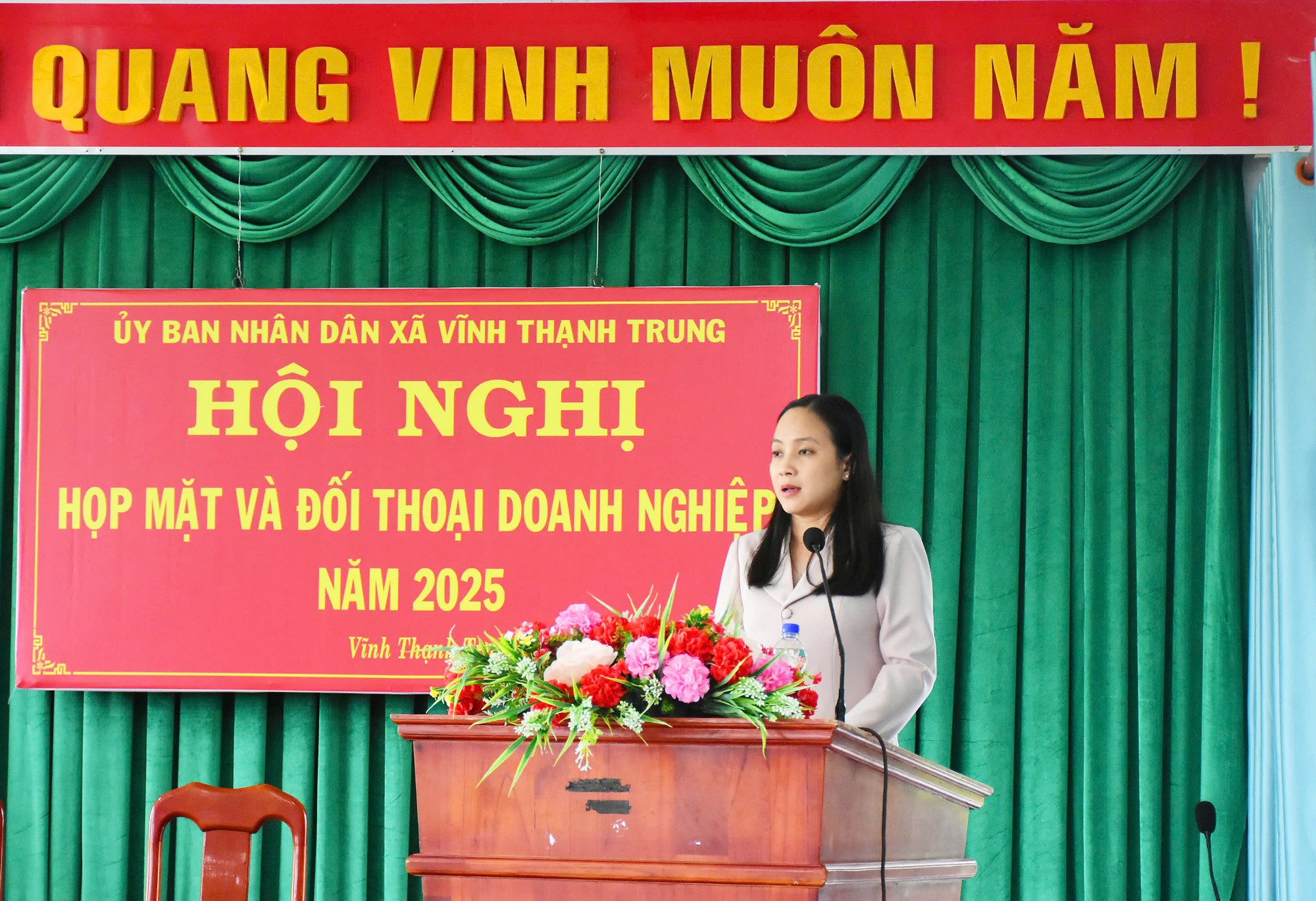 (Cổng TTĐT tỉnh AG)- Chiều 10/10, Đảng ủy, UBND xã Vĩnh Thạnh Trung tổ chức hội nghị họp mặt và đối thoại với doanh nghiệp năm 2025. Bí thư Đảng ủy xã Vĩnh Thạnh Trung Nguyễn Duy Đức, Chủ tịch UBND xã Nguyễn Xuân Nhã chủ trì hội nghị.