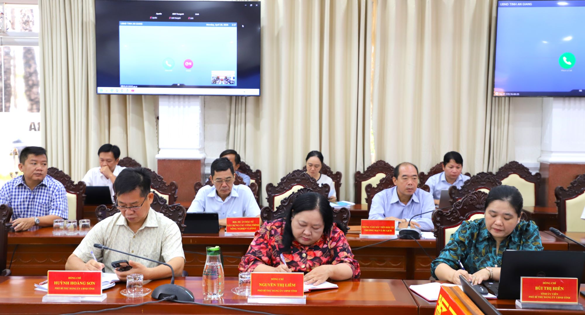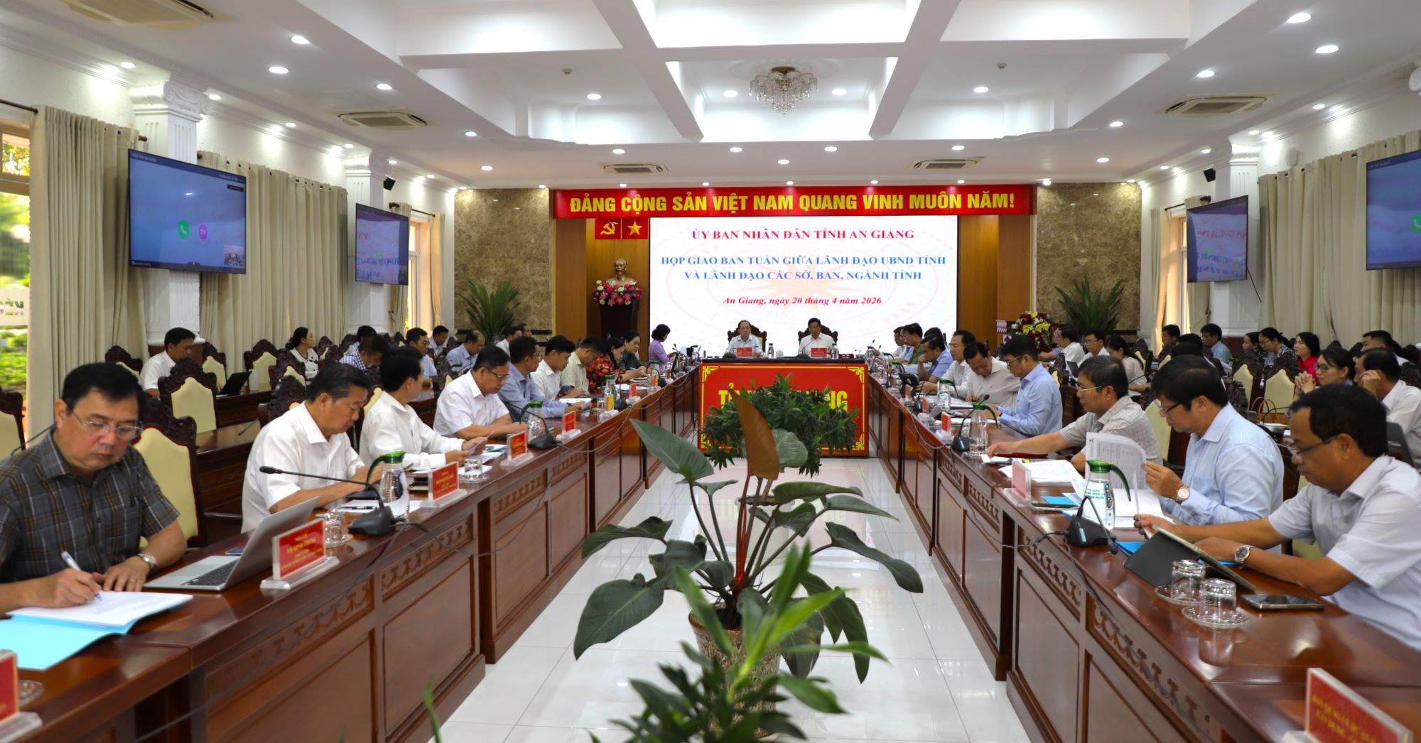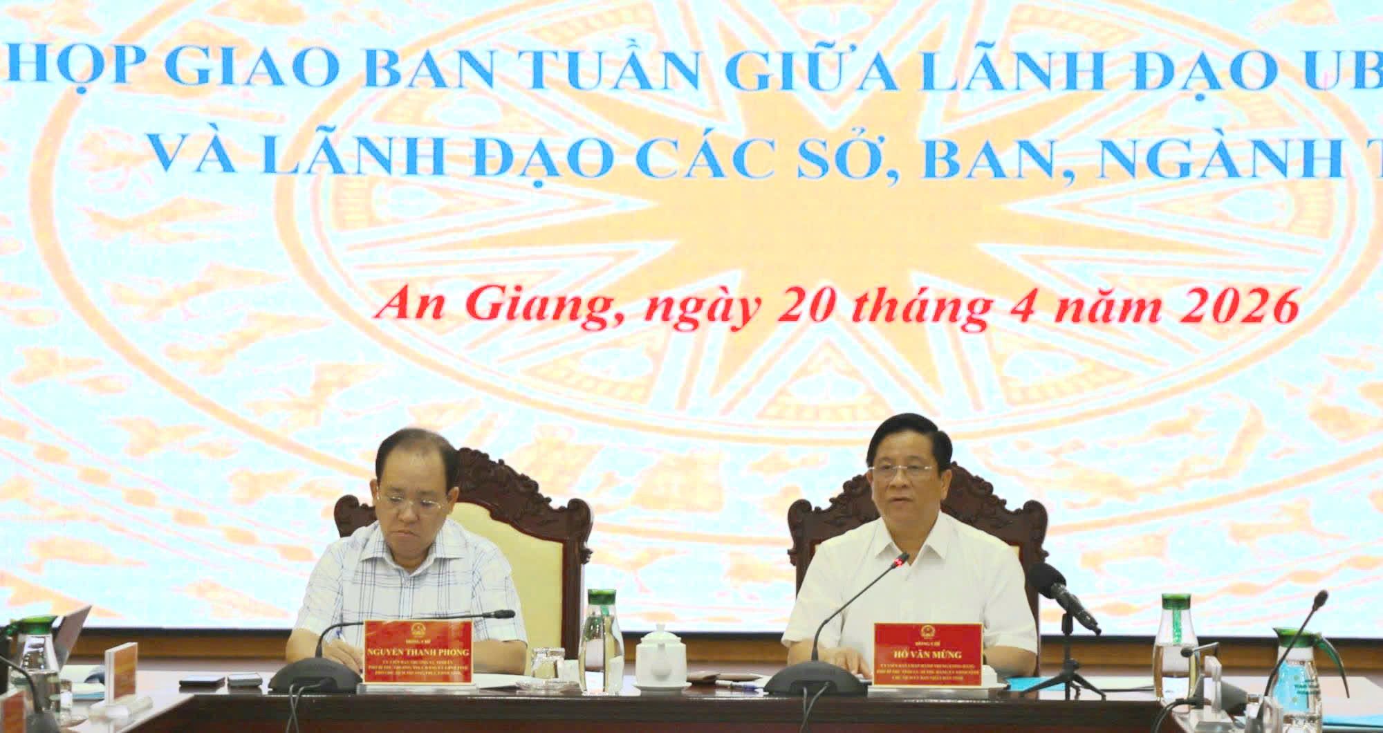 (Cổng TTĐT tỉnh AG) - Sáng ngày 20/4, UBND tỉnh An Giang tổ chức cuộc họp giao ban tuần giữa Lãnh đạo UBND tỉnh và Lãnh đạo các sở, ban, ngành. Chủ trì cuộc họp, do Ủy viên Ban Chấp hành Trung ương Đảng, Phó Bí thư Tỉnh ủy, Chủ tịch UBND tỉnh Hồ Văn Mừng; cùng tham dự, có Phó Chủ tịch Thường trực UBND tỉnh Nguyễn Thanh Phong; Lãnh đạo Đảng ủy UBND tỉnh; các Phó Chủ tịch UBND tỉnh: Lê Văn Phước; Ngô Công Thức; Nguyễn Thị Minh Thúy; trực tuyến với đặc khu Thổ Châu; đơn vị tư vấn.
