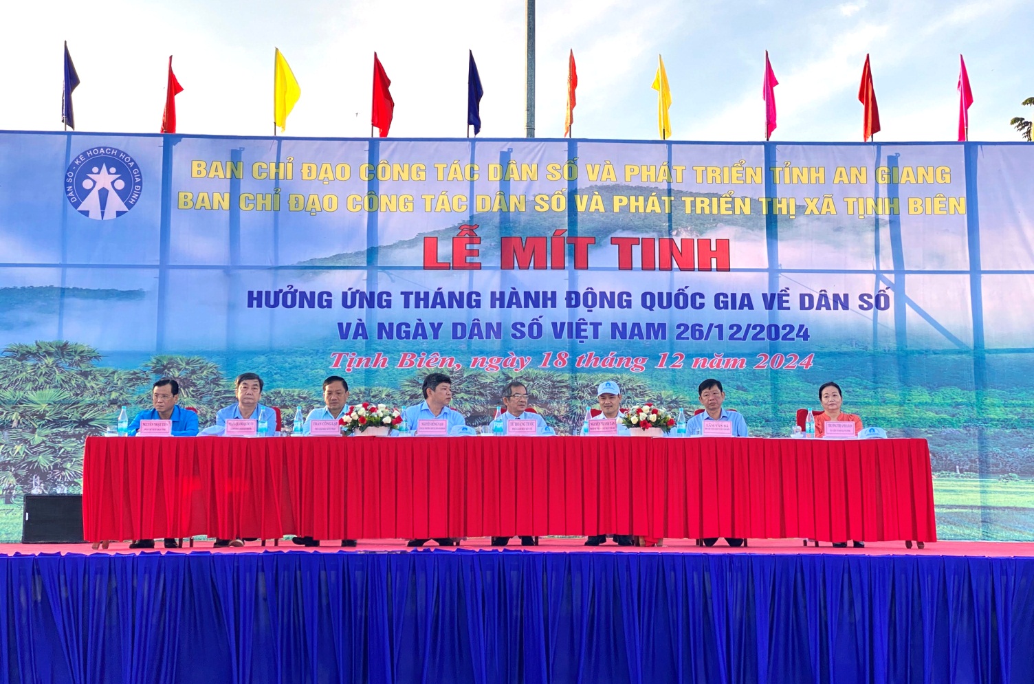(Cổng TTĐT tỉnh AG)- Sáng 18/12, Ủy ban nhân dân thị xã Tịnh Biên phối hợp Chi cục Dân số - KHHGD tỉnh An Giang tổ chức Lễ mít tinh hưởng ứng Tháng hành động quốc gia về Dân số và Ngày Dân số Việt Nam (26/12) năm 2024. Phó Giám đốc Sở Y tế Từ Hoàng Tước đến dự.