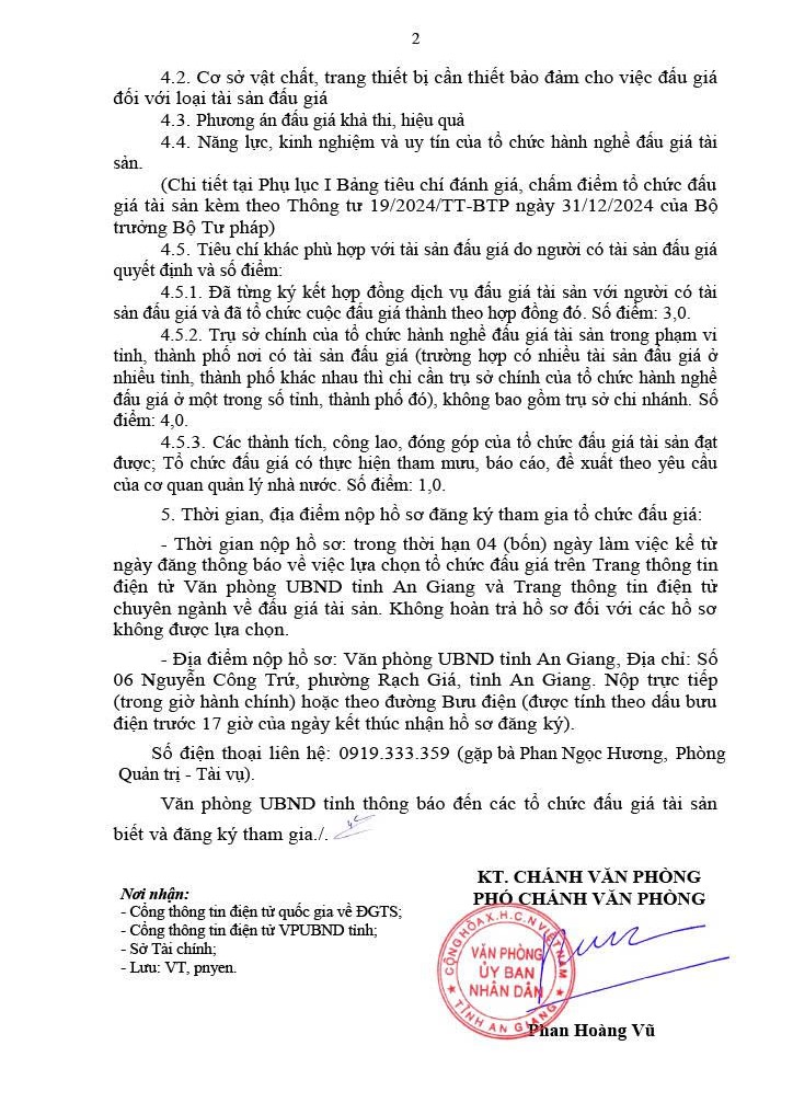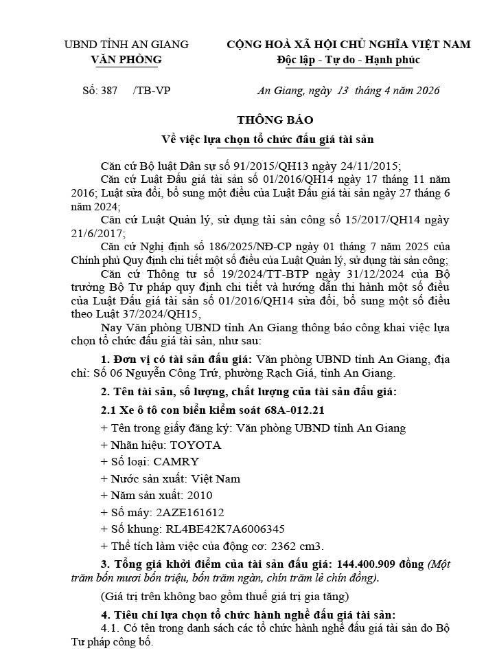 (Cổng TTĐT tỉnh AG) - Ngày 13 tháng 4 năm 2026, Văn phòng Uỷ ban nhân dân tỉnh An Giang thông báo về việc lựa chọn tổ chức đấu giá tài sản.