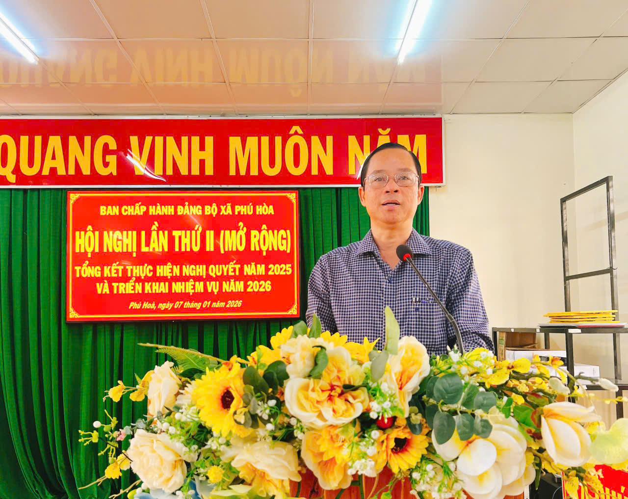 (Cổng TTĐT tỉnh AG)- Sáng ngày 07/01, Ban Thường vụ Đảng ủy xã Phú Hòa tổ chức Hội nghị Ban Chấp hành lần thứ II (mở rộng); tổng kết thực hiện Nghị quyết năm 2025 và triển khai nhiệm vụ năm 2026. Dự Hội nghị, về phía cấp tỉnh có đồng chí Nguyễn Tấn Rạng, Tỉnh ủy viên, Phó Chủ nhiệm Ủy ban Kiểm tra Tỉnh ủy; đại diện Ban Nội chính Tỉnh ủy.