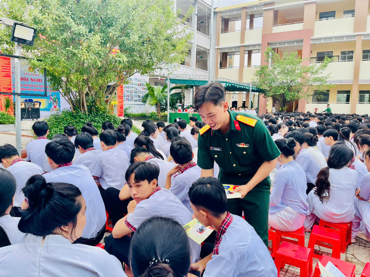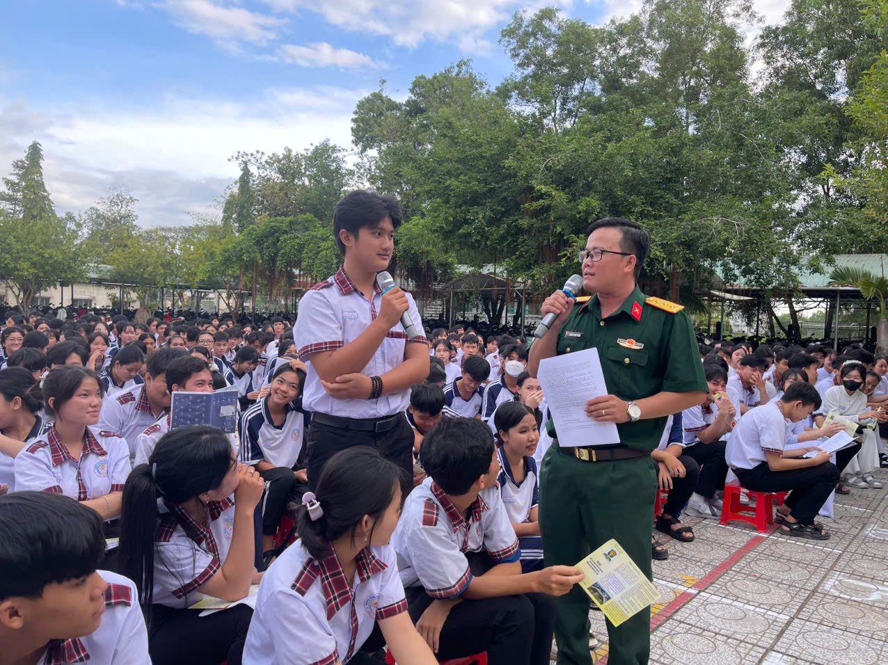 (Cổng TTĐT tỉnh AG)- Ngày 10-11, Tiểu đoàn 519, Trung đoàn 893, Bộ CHQS tỉnh An Giang phối hợp Công an, Đoàn thanh niên xã Giang Thành và Trường THPT Thoại Ngọc Hầu đã tổ chức tuyên truyền, phổ biến, giáo dục kiến thức pháp luật cho gần 800 học sinh của trường. Trung tá Trần Trọng Bình, Chính ủy Trung đoàn 893 tham dự buổi tuyên truyền.
