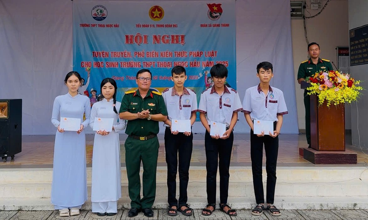Dịp này, Tiểu đoàn 519 – Trung đoàn 893 cùng với Đoàn xã Giang Thành cũng đã trao tặng 5 suất quà cho các em học sinh có hoàn cảnh khó khăn vươn lên trong học tập, mỗi suất trị giá 500.000 đồng. Đồng thời, đơn vị đã phát hơn 800 tờ gấp pháp luật để tuyên truyền đến các bạn học sinh./.