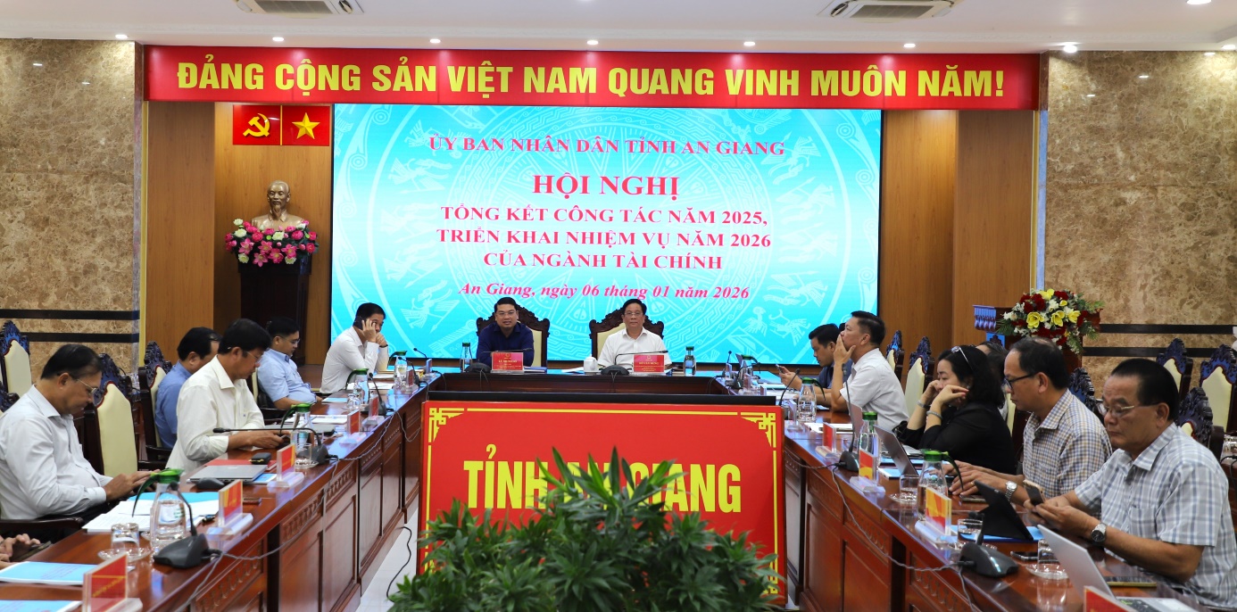 (Cổng TTĐT tỉnh AG)- Chiều ngày 06/01, Bộ Tài chính tổ chức hội nghị trực tiếp và trực tuyến với các tỉnh, thành phố về tổng kết ngành Tài chính để đánh giá tình hình thực hiện nhiệm vụ tài chính - ngân sách, đầu tư, phát triển kinh tế - xã hội năm 2025, triển khai các giải pháp thực hiện thắng lợi nhiệm vụ năm 2026.