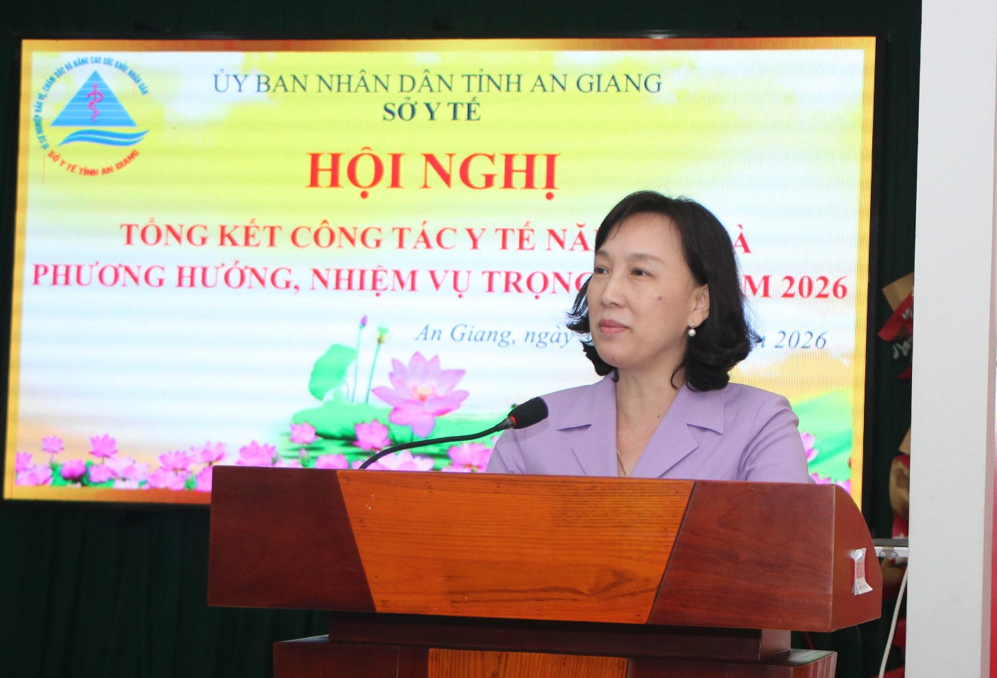 (Cổng TTĐT tỉnh AG)- Chiều 07/01, Phó Giáo sư, Tiến sĩ, Bác sĩ Trần Quang Hiền, Giám đốc Sở Y tế An Giang chủ trì Hội nghị tổng kết công tác y tế năm 2025 và triển khai phương hướng, nhiệm vụ trọng tâm năm 2026. Phó Chủ tịch UBND tỉnh An Giang Nguyễn Thị Minh Thúy đến dự và phát biểu chỉ đạo Hội nghị.