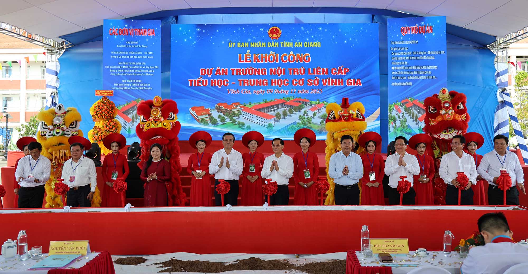 (Cổng TTĐT tỉnh AG)- Cùng với cả nước hướng về vùng biên giới thân yêu, ngày 9/11, thầy trò vùng biên giới An Giang hân hoan đón niềm vui mới. UBND tỉnh An Giang đã đồng loạt khởi công 3 trường nội trú liên cấp, theo chủ trương thí điểm đầu tư xây dựng hoặc cải tạo 100 trường phổ thông nội trú liên cấp tiểu học và THCS tại các xã biên giới đất liền trong năm 2025 của Bộ Chính trị.