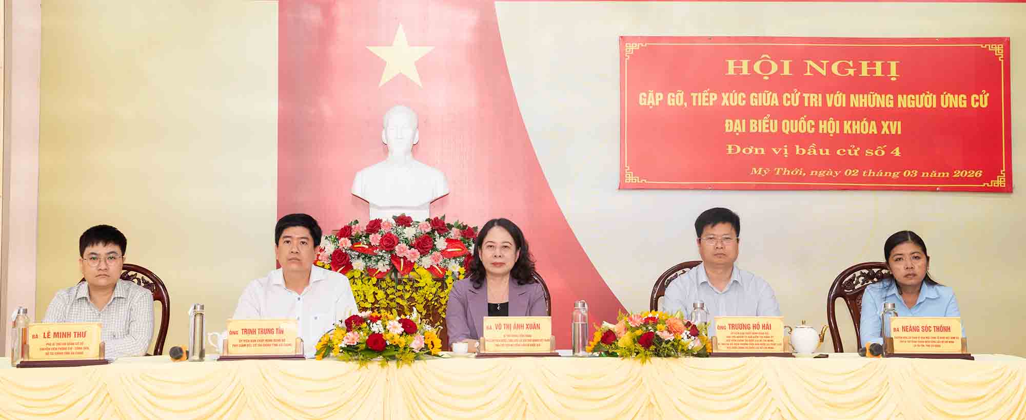 Đơn vị bầu cử số 4 có các ứng cử viên đại biểu Quốc hội khóa XVI, gồm: Bà Võ Thị Ánh Xuân, Bí thư Trung ương Đảng, Phó Chủ tịch nước, Phó Chủ tịch Hội đồng bầu cử Quốc gia; ông Trương Hồ Hải, Ủy viên Ban Chấp hành Đảng bộ, Phó Chủ nhiệm Ủy ban Ủy ban Kiểm tra Đảng ủy Học viện; Bí thư Chi bộ, Viện trưởng Viện Nhà nước và Pháp luật, Học viện Chính trị Quốc gia Hồ Chí Minh; ông Trịnh Trung Tín, Ủy viên Ban Chấp hành Đảng bộ, Phó Giám đốc Sở Tài chính tỉnh An Giang; bà Lê Minh Thư, Phó Bí thư Chi đoàn cơ sở, Chuyên viên phòng Giá - Công sản, Sở Tài chính tỉnh An Giang; bà Neáng Sóc Thônh, chuyên viên Ủy ban MTTQ Việt Nam xã, Phó Bí thư Đoàn TNCS Hồ Chí Minh xã Tri Tôn, tỉnh An Giang.