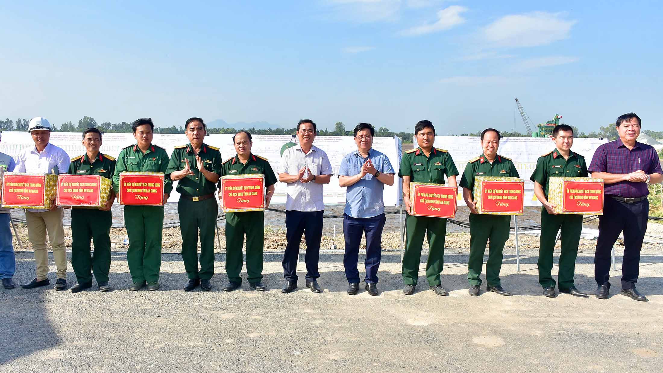Dịp này, Chủ tịch UBND tỉnh An Giang Hồ Văn Mừng đã tặng quà động viên lực lượng đang thi công tại công trường./.