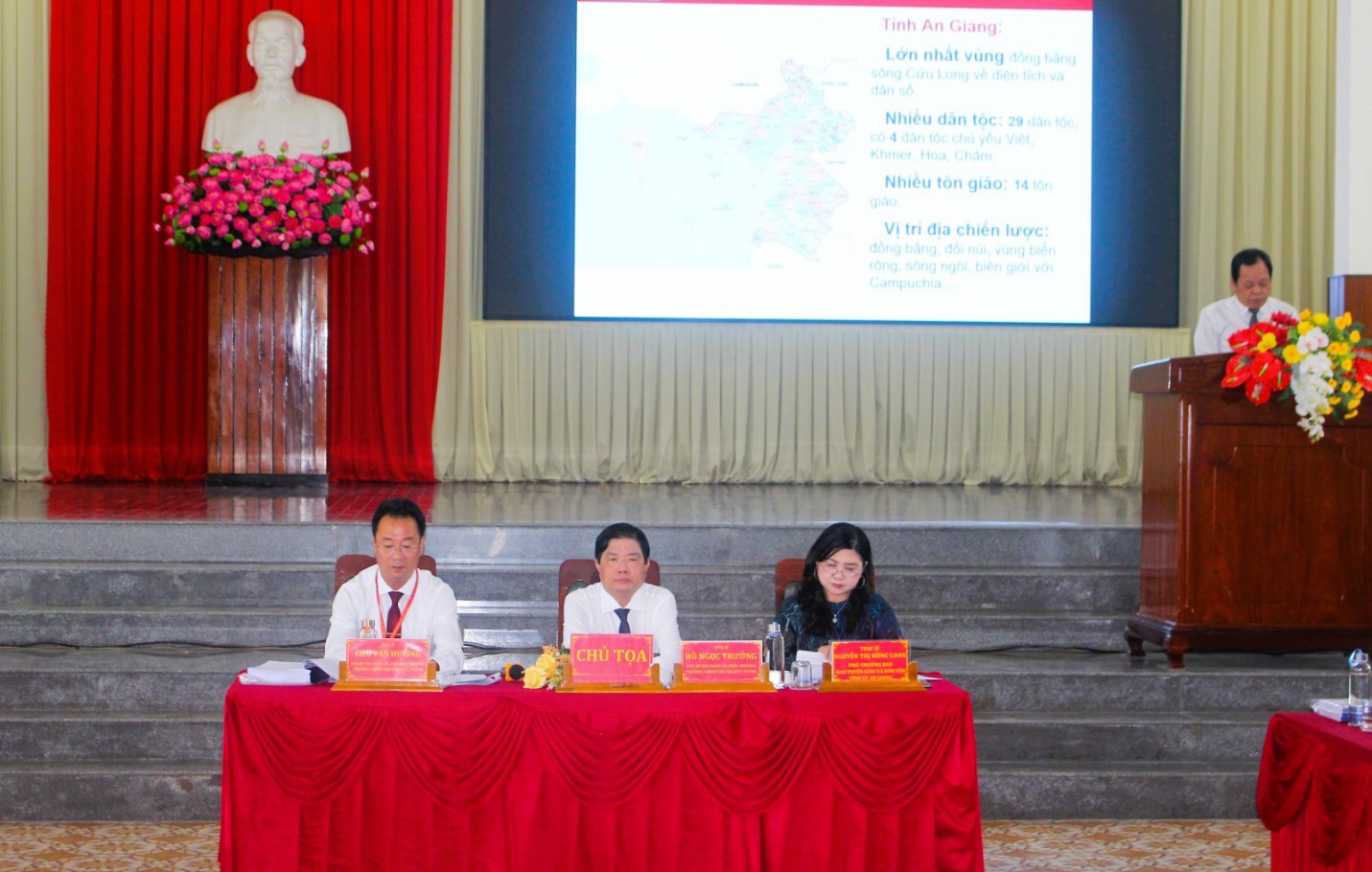 TS. Hồ Ngọc Trường, Hiệu trưởng Trường Chính trị Tôn Đức Thắng; Phó Trưởng ban Ban Tuyên giáo và Dân vận Tỉnh ủy An Giang Nguyễn Thị Hồng Loan; TS. Chu Văn Hưởng, Phó Hiệu trưởng Trường Chính trị Tôn Đức Thắng chủ tọa hội thảo.