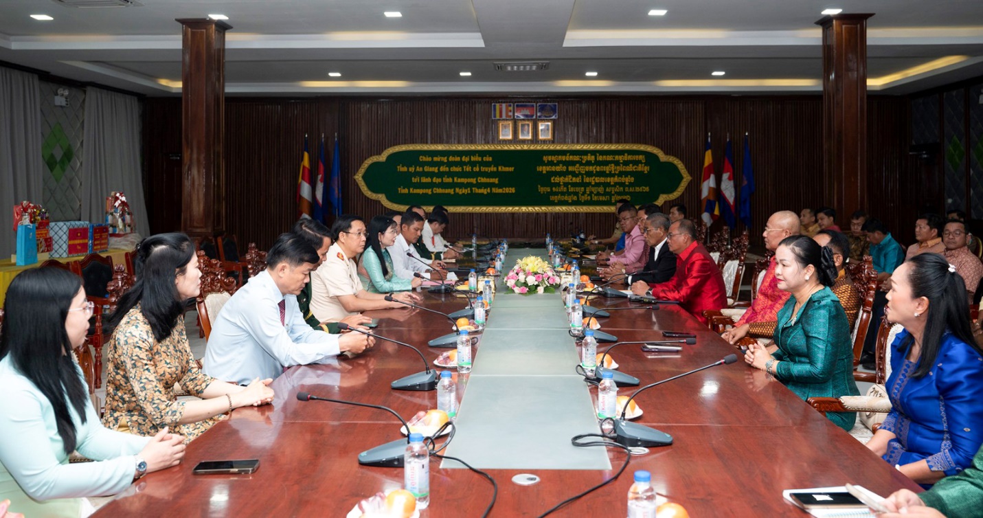 (Cổng TTĐT tỉnh AG)- Sáng 01/4, đoàn công tác của Tỉnh ủy An Giang do Phó Bí thư Tỉnh ủy, Chủ tịch Ủy ban MTTQ Việt Nam tỉnh An Giang Trần Thị Thanh Hương làm trưởng đoàn đến thăm và chúc Tết Chôl Chnăm Thmây năm 2026 tại tỉnh Kampong Chhnang (Vương quốc Campuchia). Ngài Siêu Rung, Chủ tịch Hội đồng tỉnh Kampong Chhnang và ngài Sun So Van Na Rich, Tỉnh trưởng tỉnh Kampong Chhnang tiếp đoàn.