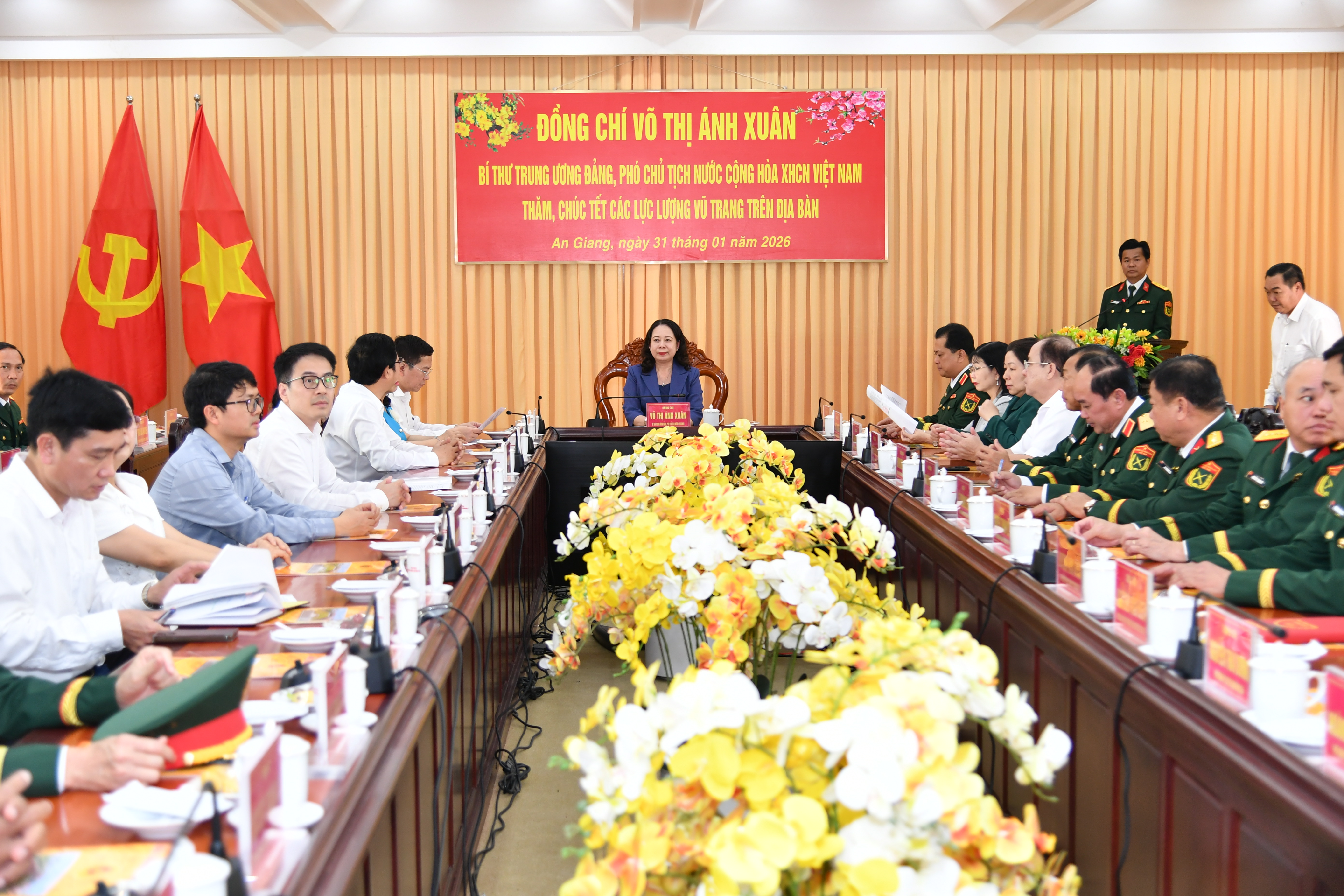 Nhân dịp năm mới Xuân Bính Ngọ 2026, thay mặt lãnh đạo Đảng, Nhà nước, Phó Chủ tịch nước Võ Thị Ánh Xuân đã ân cần thăm hỏi, động viên và gửi lời chúc mừng năm mới tốt đẹp nhất đến cán bộ, chiến sĩ các lực lượng vũ trang tỉnh An Giang; mong muốn các đơn vị tiếp tục phát huy truyền thống đoàn kết, chủ động, sáng tạo, hoàn thành xuất sắc mọi nhiệm vụ được giao, góp phần giữ vững môi trường hòa bình, ổn định để xây dựng và phát triển tỉnh An Giang ngày càng giàu đẹp.
