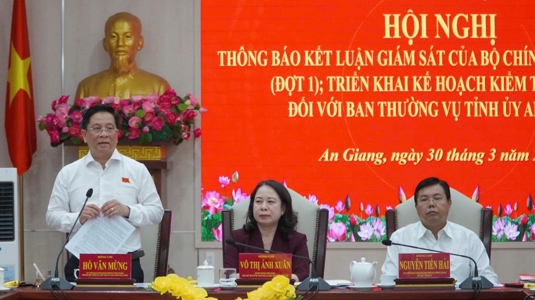 Phó Chủ tịch nước Võ Thị Ánh Xuân, đề nghị thời gian tới Ban Thường vụ Tỉnh ủy An Giang quán triệt và triển khai thực hiện nghiêm túc Thông báo kết luận của Bộ Chính trị, Ban Bí thư; xây dựng kế hoạch thực hiện Kết luận giám sát đảm bảo rõ người, rõ việc, rõ trách nhiệm, rõ thời gian hoàn thành, phát huy những ưu điểm, kết quả đạt được; tập trung khắc phục các hạn chế, khuyết điểm đã được chỉ ra.