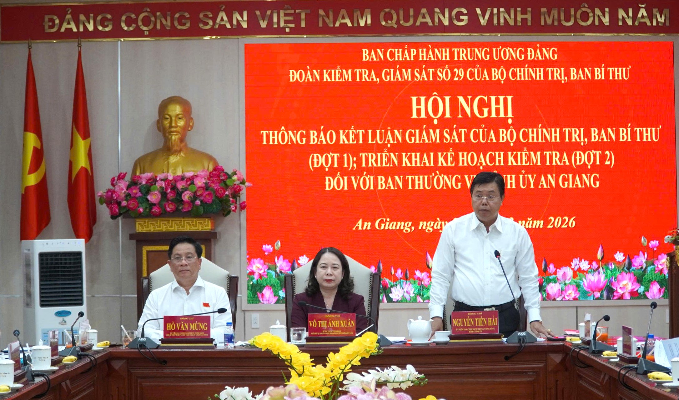 (Cổng TTĐT tỉnh AG) - Ngày 30/3, Đoàn Kiểm tra, giám sát số 29 của Bộ Chính trị, Ban Bí thư do Bí thư Trung ương Đảng, Phó Chủ tịch nước Võ Thị Ánh Xuân làm Trưởng đoàn đã có buổi làm việc với Ban Thường vụ Tỉnh ủy An Giang để triển khai thông báo kết luận của Bộ Chính trị, Ban Bí thư về kết quả giám sát Đợt 1 đối với Ban Thường vụ Tỉnh uỷ An Giang và triển khai kế hoạch kiểm tra (đợt 2) đối với Ban Thường vụ Tỉnh ủy An Giang.