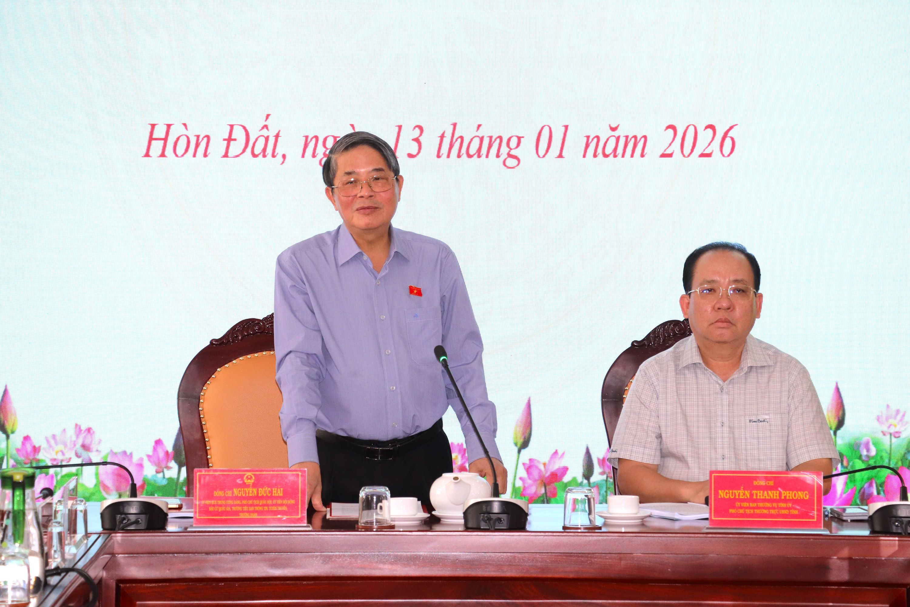 Phó Chủ tịch Quốc hội Nguyễn Đức Hải lưu ý địa phương, thời gian từ nay đến ngày bầu cử không còn nhiều nên xã Hòn Đất cần tập trung chỉ đạo, tăng cường công tác kiểm tra, đôn đốc, đảm bảo triển khai thực hiện hoàn thành các nội dung công việc theo các mốc thời gian quy định; tập trung thực hiện tốt công tác tiếp nhận, giải quyết đơn thư khiếu nại, tố cáo, đảm bảo an ninh trật tự địa phương.