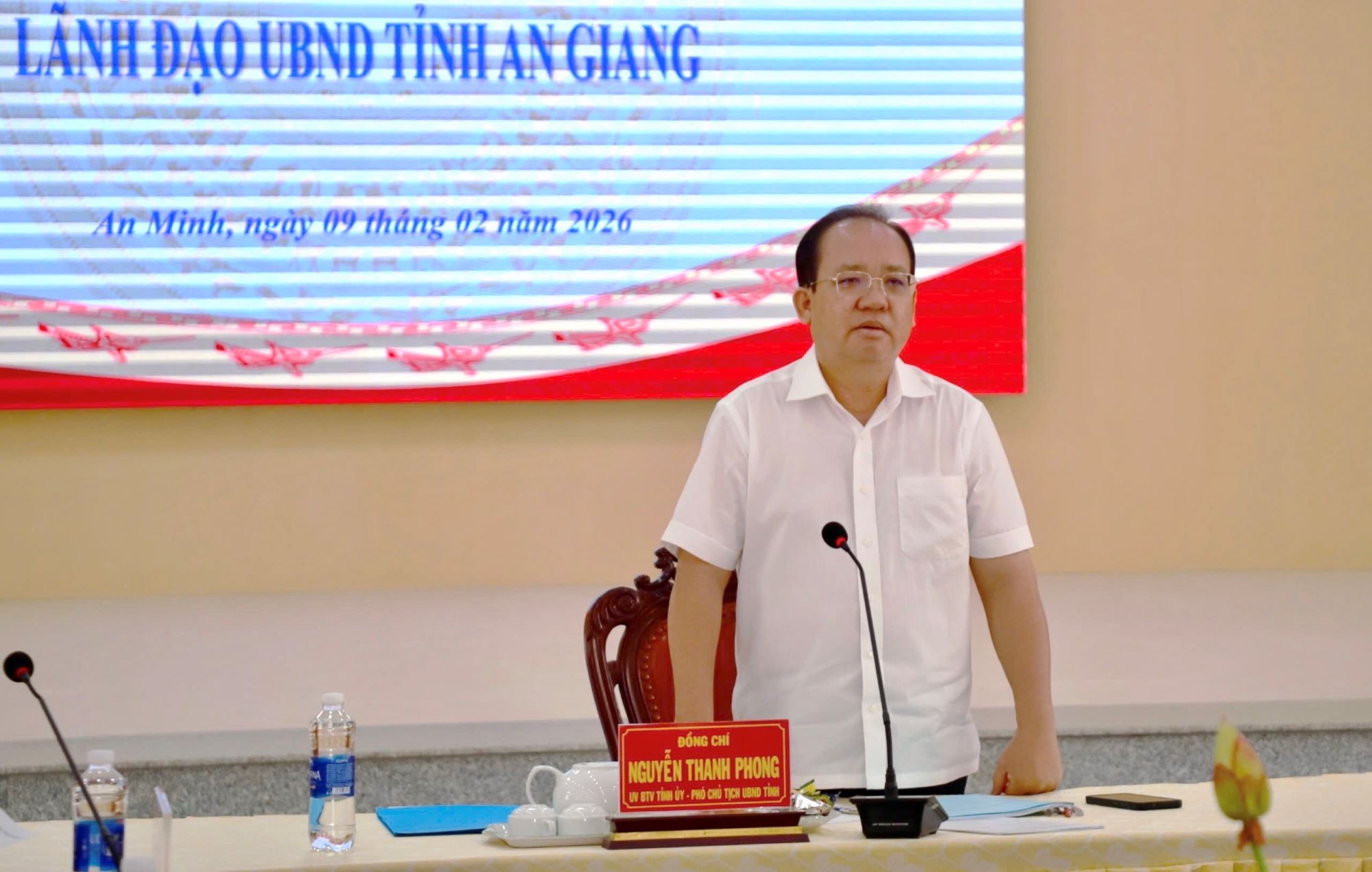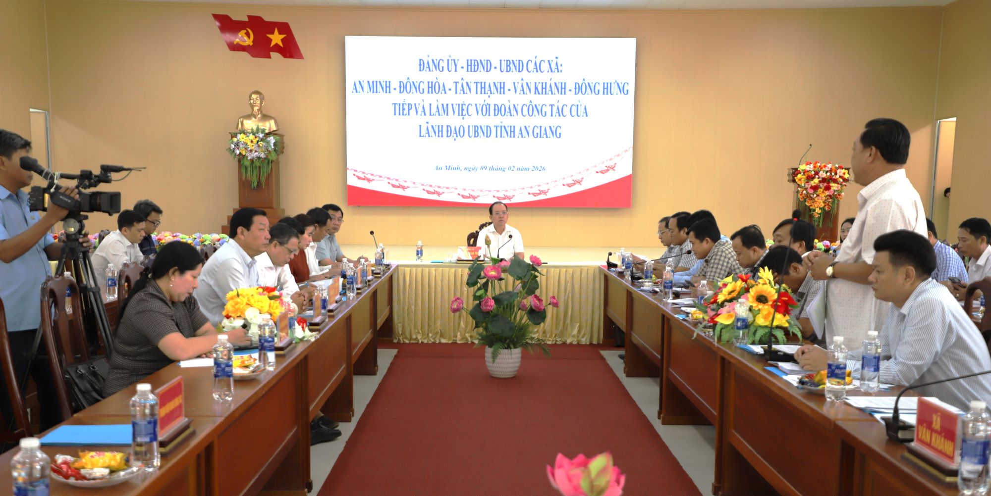 (Cổng TTĐT tỉnh AG) - Sáng ngày 09/02, Ủy viên Ban Thường vụ Tỉnh ủy, Phó Chủ tịch Thường trực UBND tỉnh An Giang Nguyễn Thanh Phong làm Trưởng đoàn đến làm việc với 05 xã: An Minh, Đông Hòa, Đông Hưng, Vân Khánh, Tân Thạnh về công tác chuẩn bị Tết Nguyên đán Bính Ngọ năm 2026; công tác chuẩn bị bầu cử đại biểu Quốc hội khóa XVI và đại biểu HĐND các cấp nhiệm kỳ 2026 - 2031; công tác tuyển quân, những khó khăn, vướng mắc của địa phương.