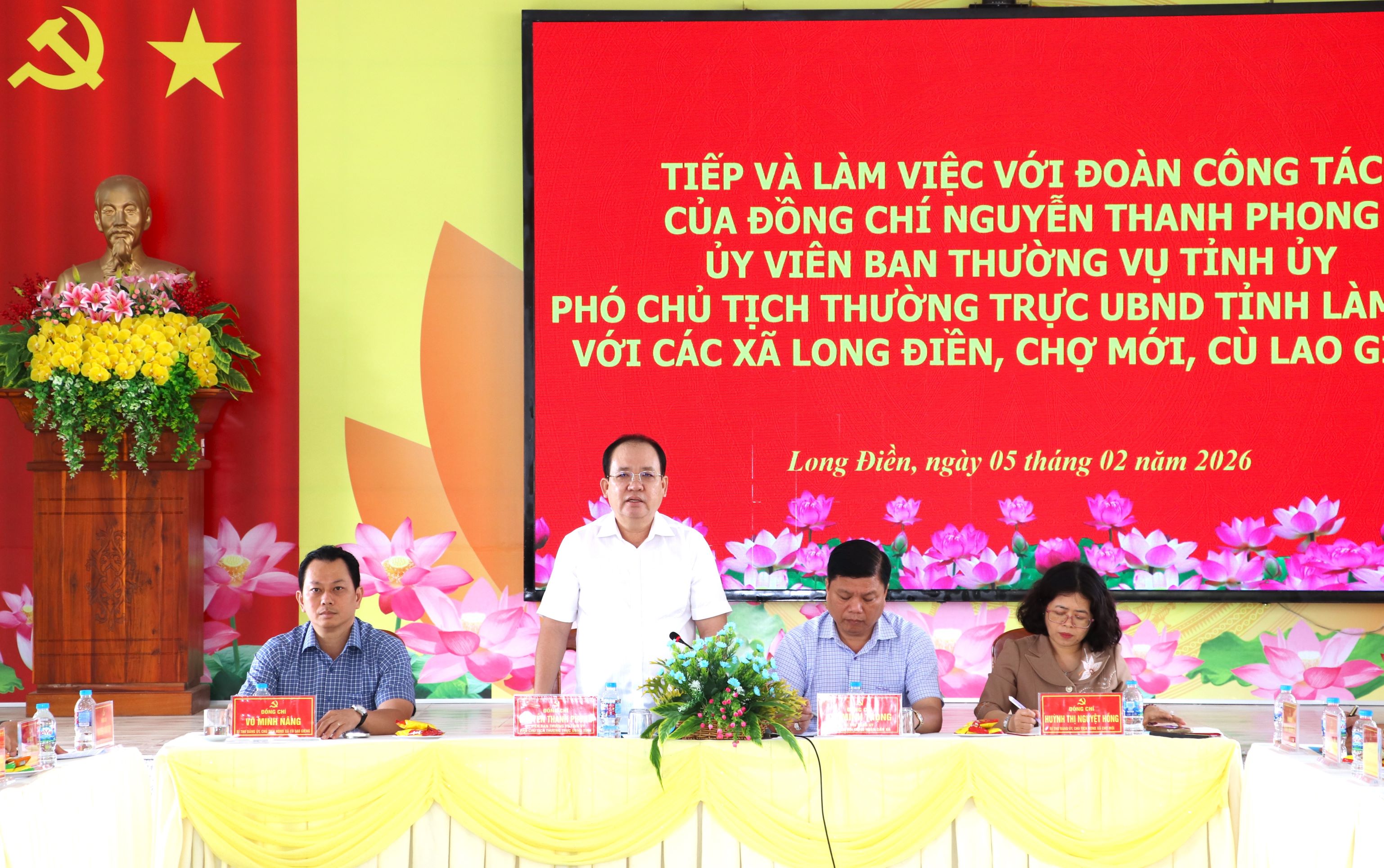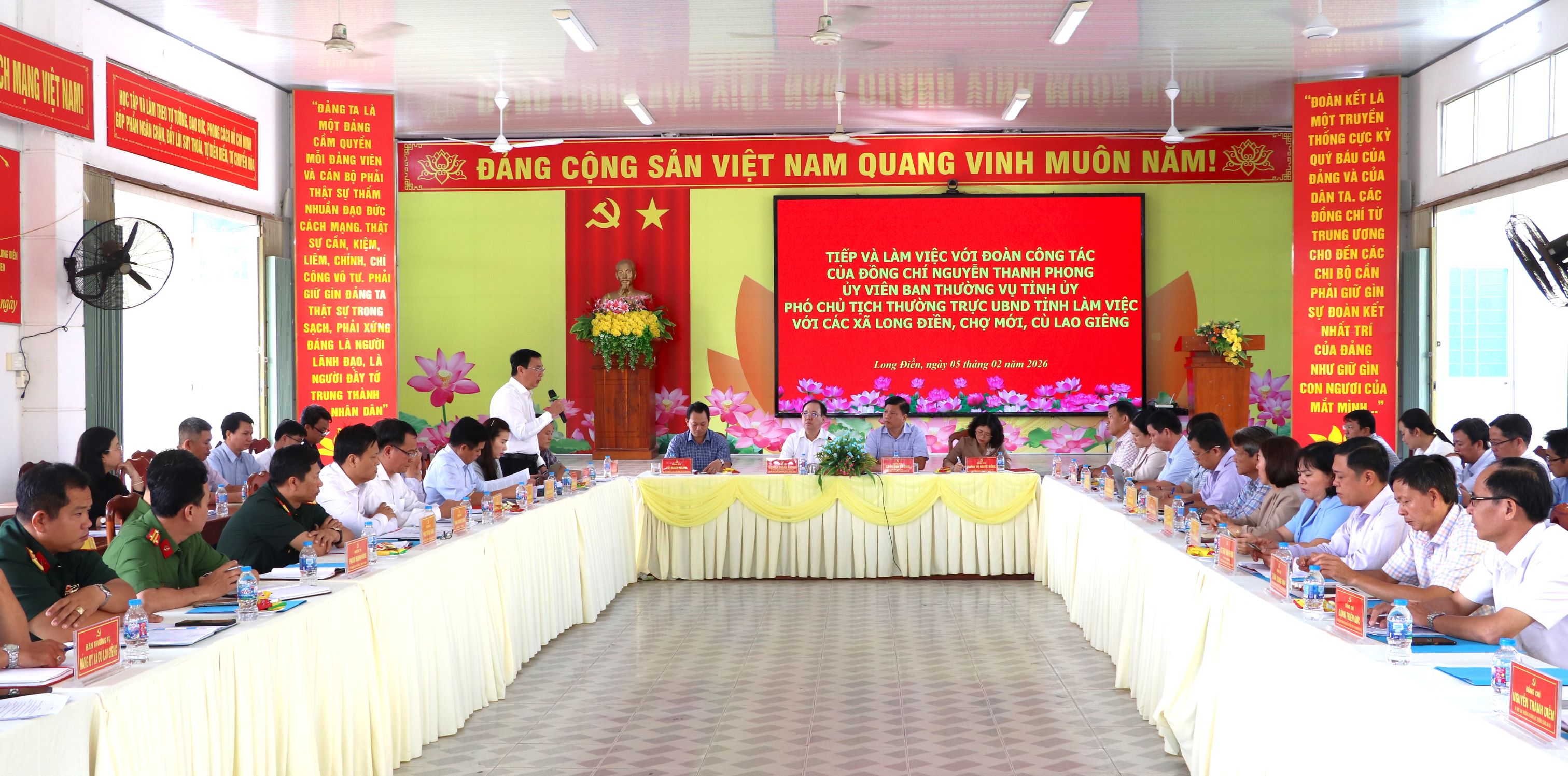 (Cổng TTĐT tỉnh AG) – Ngày 05/02, Ủy viên Ban Thường vụ Tỉnh ủy, Phó Chủ tịch Thường trực UBND tỉnh An Giang Nguyễn Thanh Phong làm Trưởng đoàn công tác đến làm việc, nghe báo cáo kết quả triển khai chương trình công tác năm 2026; kiểm tra công tác bầu cử đại biểu Quốc hội khóa XVI và đại biểu HĐND các cấp nhiệm kỳ 2026 - 2031 tại các xã: Long Điền, Chợ Mới, Cù Lao Giêng (tỉnh An Giang).