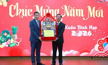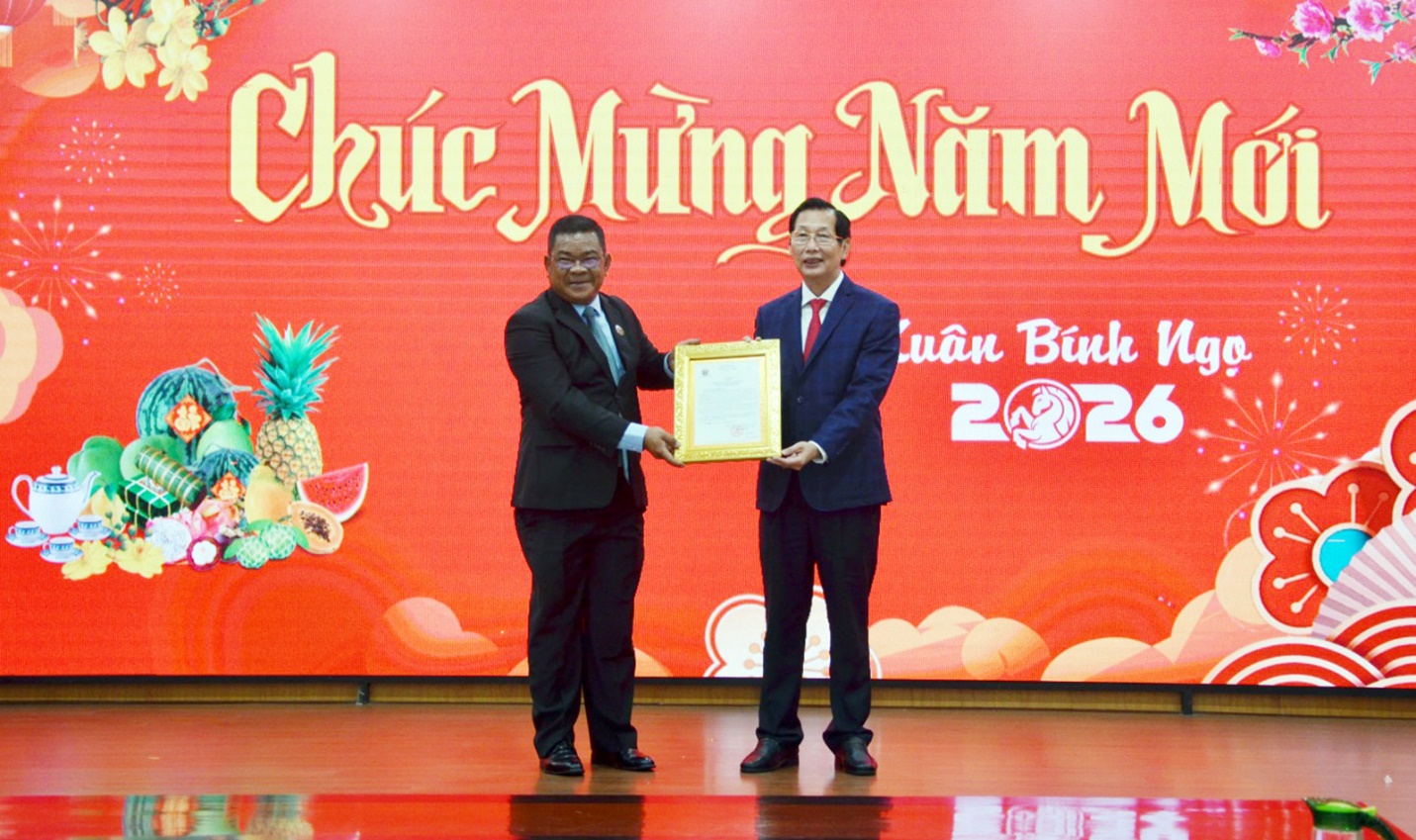 (Cổng TTĐT tỉnh AG)- Sáng 06/02, Phó Chủ tịch UBND tỉnh An Giang Lê Văn Phước tiếp đoàn đại biểu do ông Chea Sokirth, Phó Tỉnh trưởng tỉnh Kampong Chhnang (Vương quốc Campuchia) dẫn đầu sang thăm, chúc Tết lãnh đạo UBND tỉnh An Giang, nhân dịp Xuân Bính Ngọ 2026.