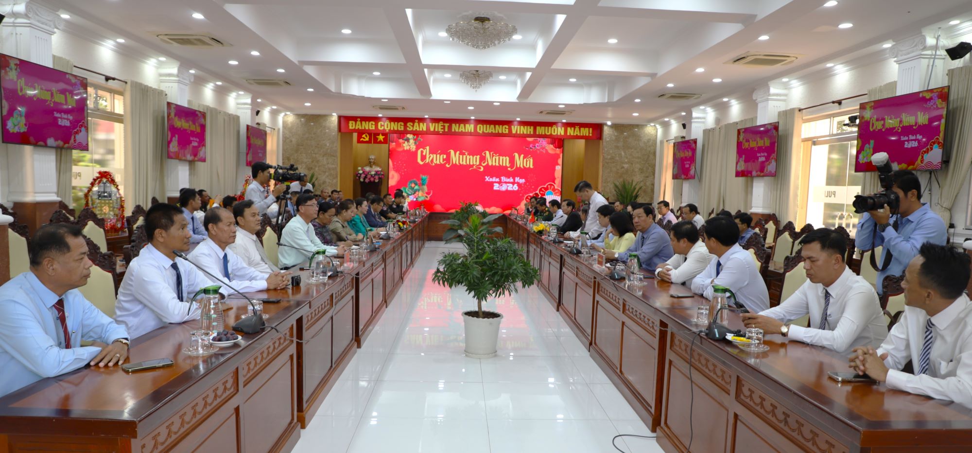 (Cổng TTĐT tỉnh AG) - Chiều ngày 05/02, Phó Chủ tịch UBND tỉnh An Giang Lê Văn Phước tiếp Đoàn đại biểu tỉnh Kandal - Vương quốc Campuchia, do Ngài Nut Puthdara (Nút-Púth-Đa-Ra), Phó Tỉnh trưởng tỉnh Kandal làm Trưởng đoàn sang thăm và chúc Tết Lãnh đạo UBND tỉnh An Giang nhân dịp Tết Nguyên đán Bính Ngọ năm 2026.