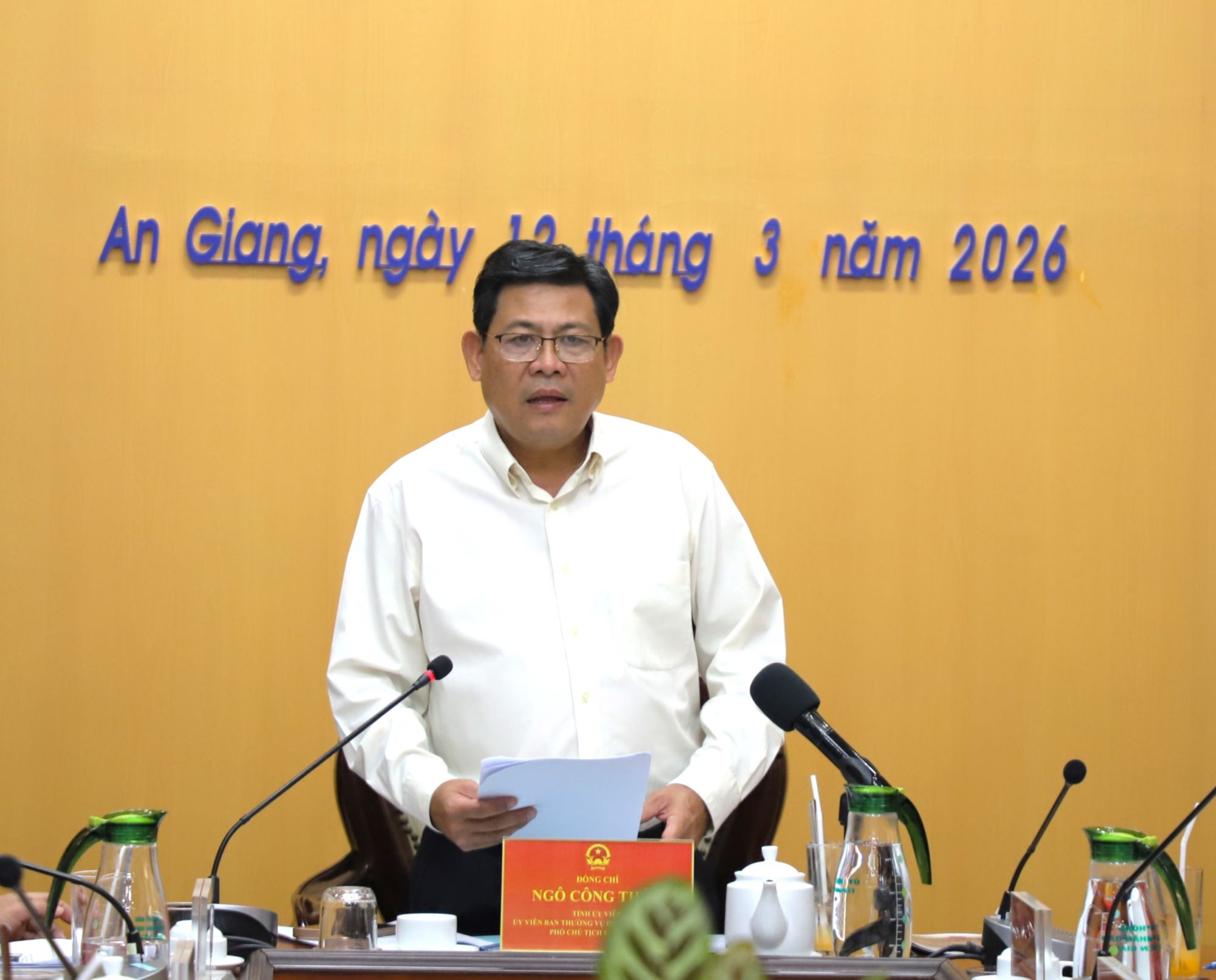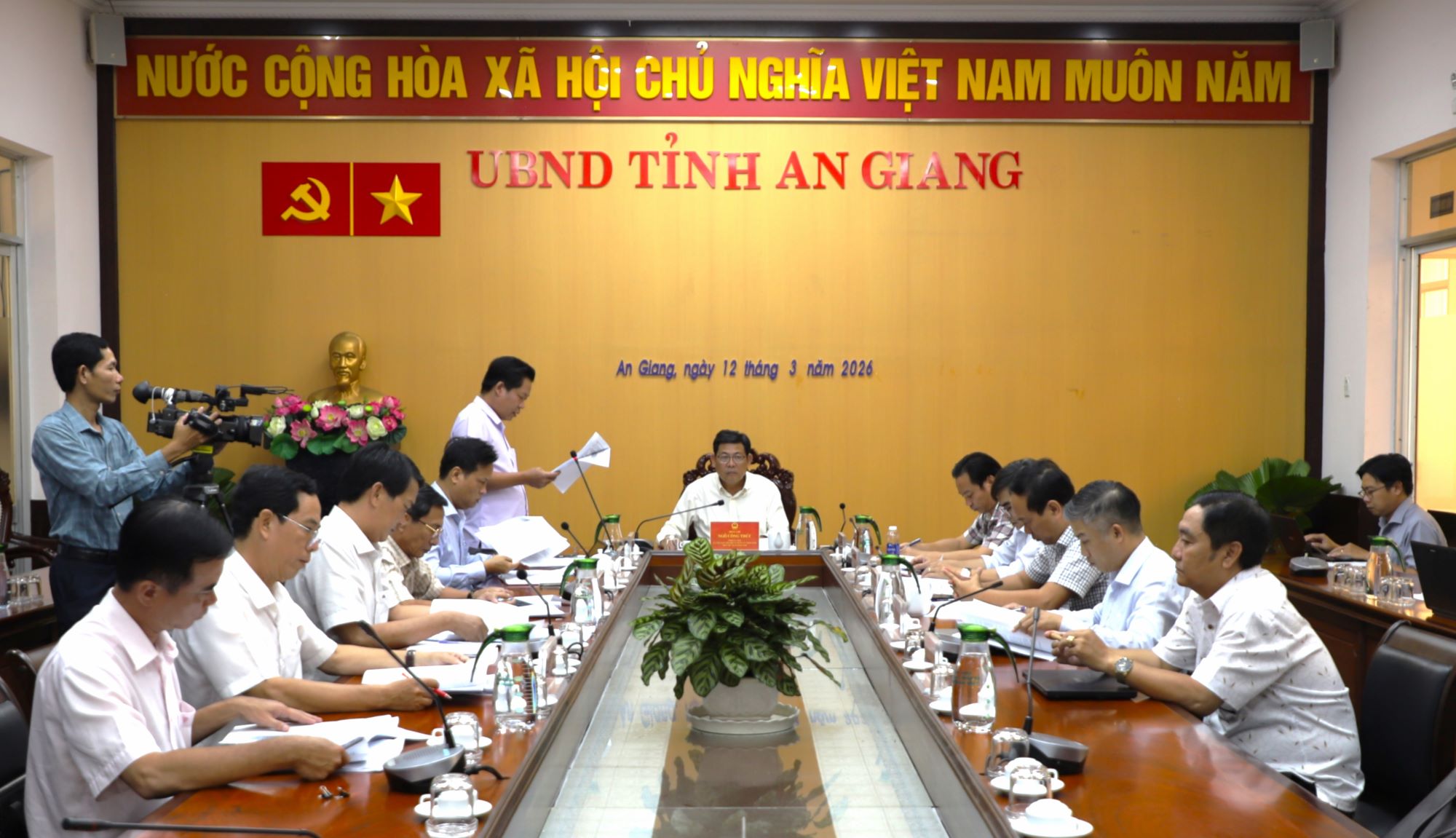 (Cổng TTĐT tỉnh AG) - Chiều ngày 12/3, Phó Chủ tịch UBND tỉnh An Giang Ngô Công Thức chủ trì cuộc họp nghe báo cáo tiến độ triển khai và xử lý các khó khăn, vướng mắc thực hiện đầu tư các công trình, dự án xử lý chất thải rắn sinh hoạt trên địa bàn tỉnh. Đại diện Lãnh đạo các sở, ban, ngành liên quan cùng tham dự; trực tuyến với các xã, phường: Mỹ Thuận, Long Thạnh, Giang Thành, Kiên Lương, Bình Hòa, Chợ Vàm, Long Điền, Hội An, Ô Lâm, Vĩnh Tế, An Cư.