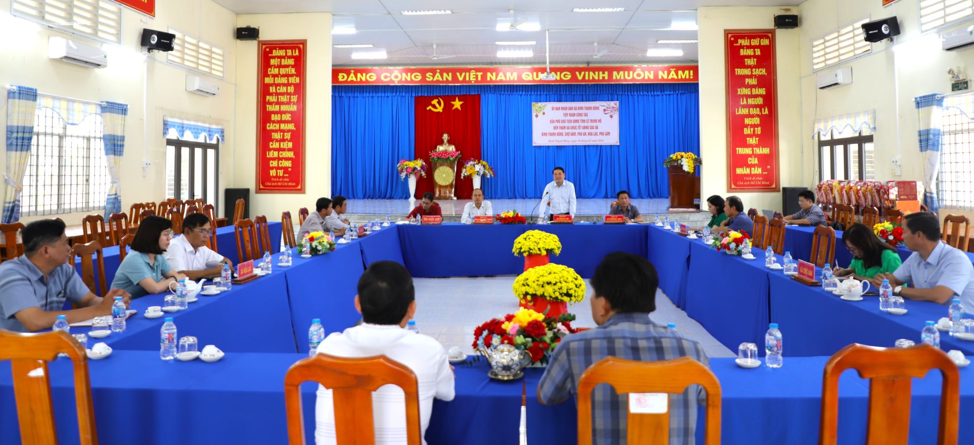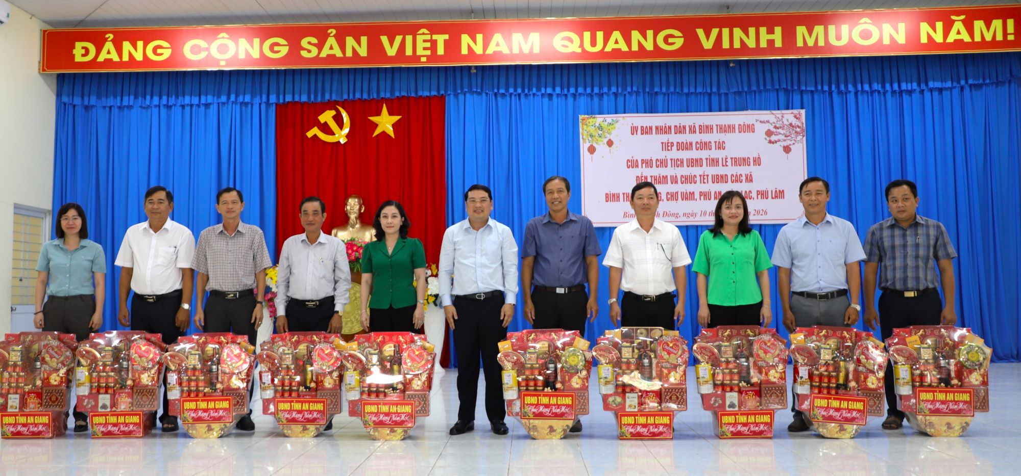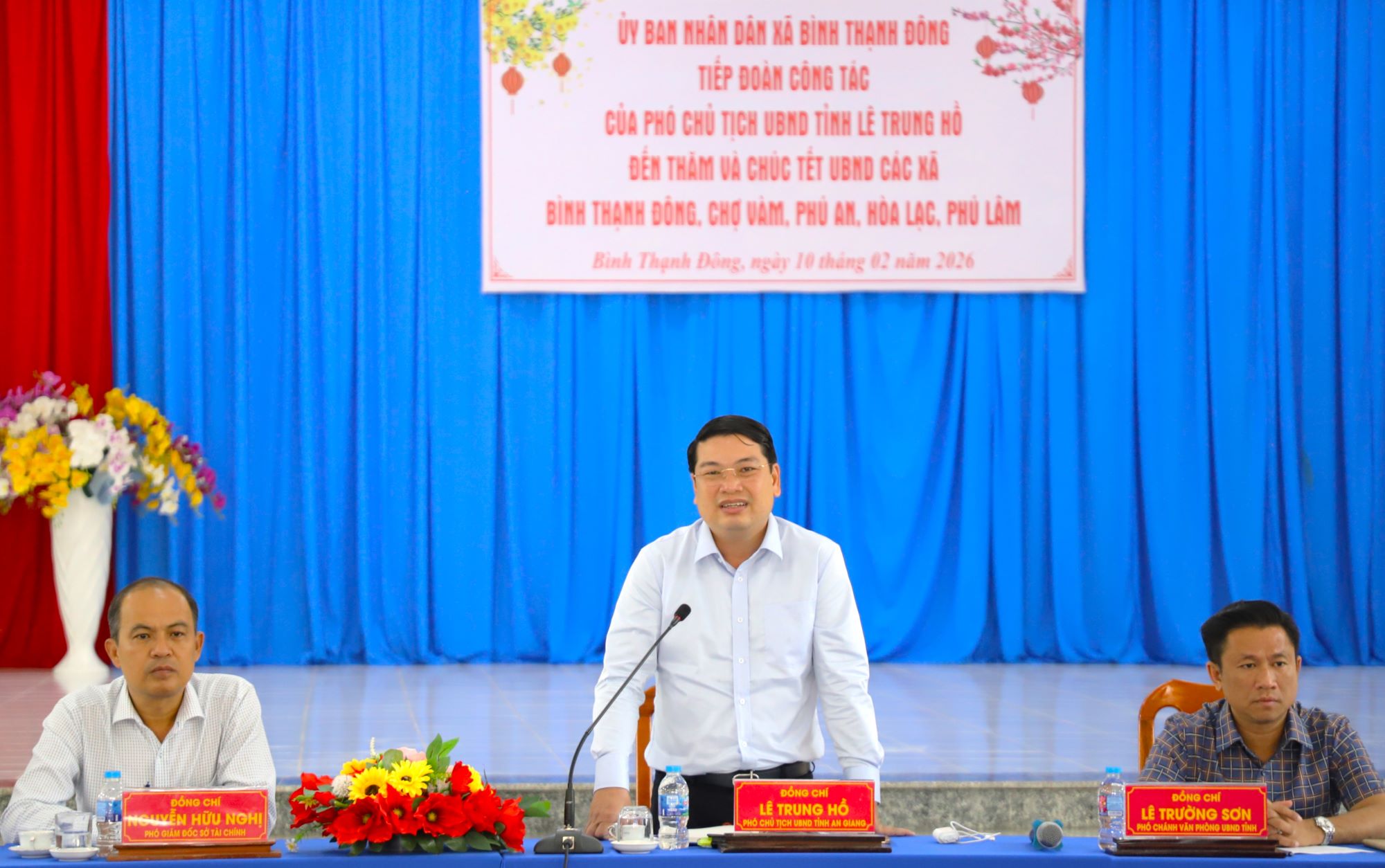 (Cổng TTĐT tỉnh AG) - Chiều ngày 10/02, Phó Chủ tịch UBND tỉnh An Giang Lê Trung Hồ cùng đoàn công tác đến thăm, chúc Tết, tặng quà cho Đảng ủy, UBND các xã Phú An, Bình Thạnh Đông, Chợ Vàm, Hòa Lạc, Phú Lâm, Châu Phú, Mỹ Đức, Vĩnh Thạnh Trung, Bình Mỹ, Thạnh Mỹ Tây nhân dịp Tết Nguyên đán Bính Ngọ năm 2026.