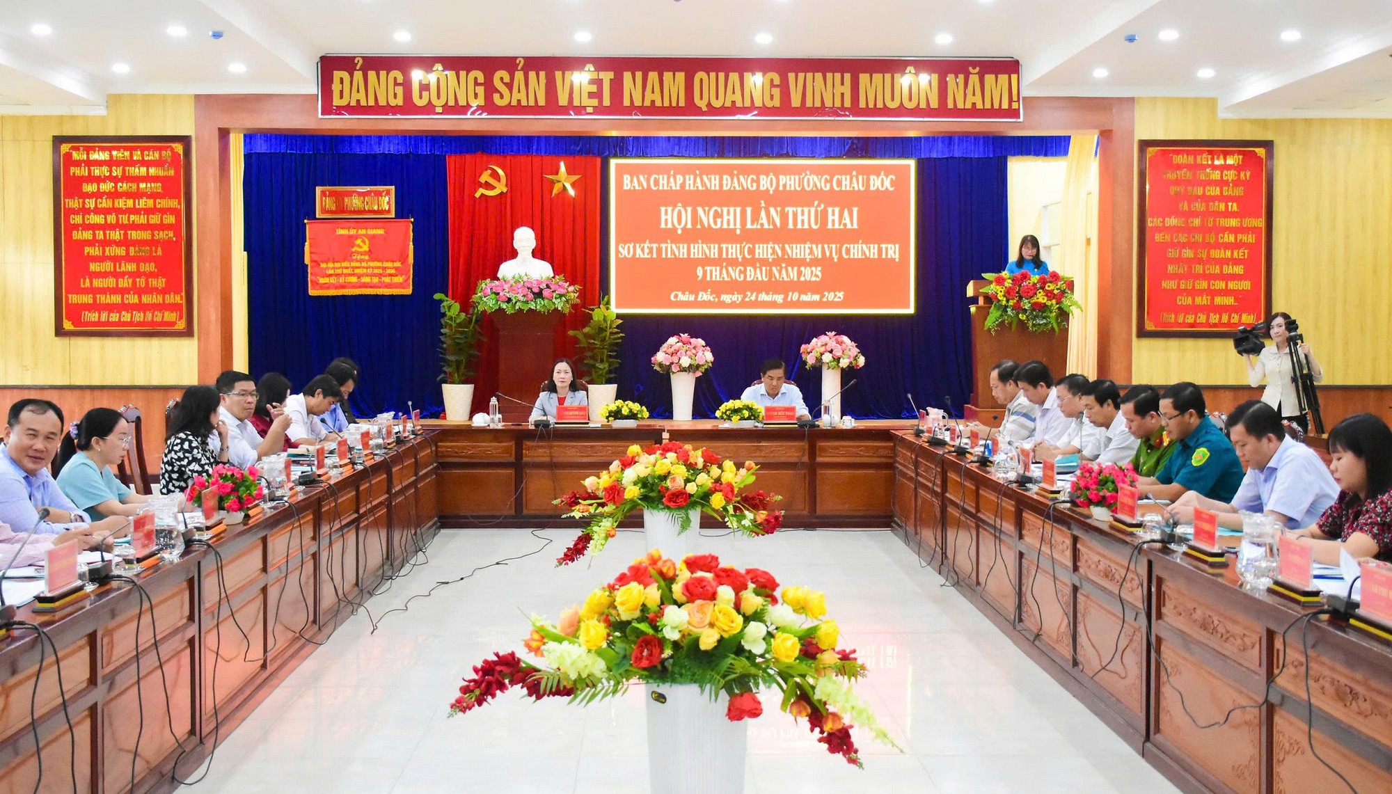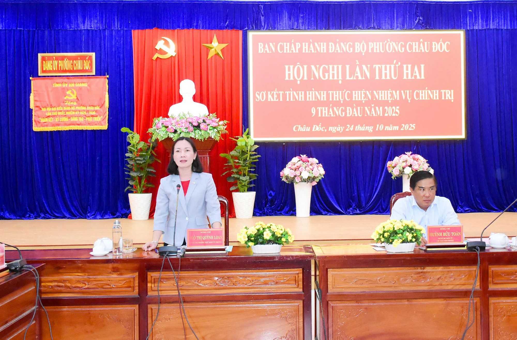 (Cổng TTĐT tỉnh AG)- Chiều 24/10, Phó Bí thư Thường trực Đảng ủy phường Châu Đốc Ngô Thị Quỳnh Loan chủ trì Hội nghị Ban Chấp hành Đảng bộ phường lần thứ 12, nhằm đánh giá kết quả thực hiện nhiệm vụ 9 tháng của năm, đề ra phương hướng thực hiện 3 tháng cuối năm 2025. Phó Trưởng Ban Tuyên giáo và Dân vận Tỉnh ủy An Giang Nguyễn Hữu Thịnh đã đến dự.