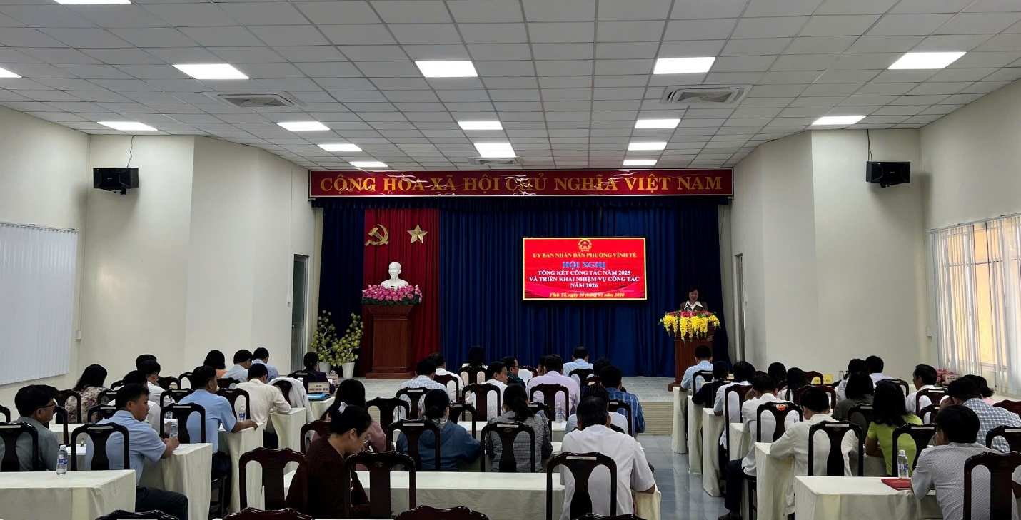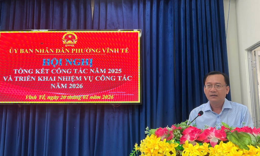 (Cổng TTĐT tỉnh AG)- Sáng 20/01, Phó Bí thư Đảng ủy, Chủ tịch UBND phường Vĩnh Tế Ngô Thị Mỹ Ngọc chủ trì Hội nghị tổng kết công tác năm 2025 và triển khai nhiệm vụ công tác năm 2026. Đến dự và phát biểu chỉ đạo có Bí thư Đảng ủy, Chủ tịch HĐND phường Trang Công Cường.