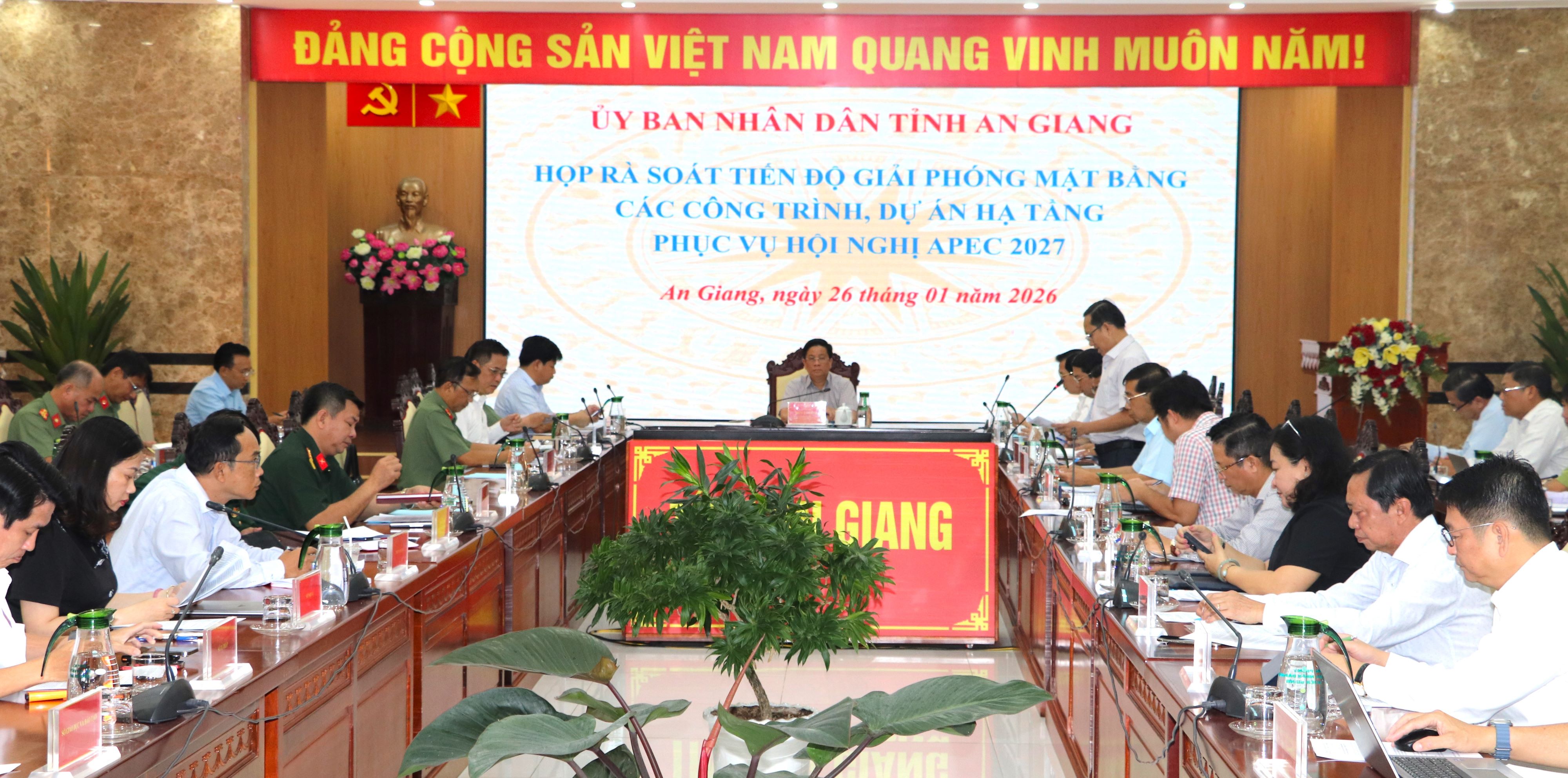 (Cổng TTĐT tỉnh AG) – Ngày 26/01, Ủy viên Ban Chấp hành Trung ương Đảng, Phó Bí thư Tỉnh ủy, Chủ tịch UBND tỉnh Hồ Văn Mừng chủ trì cuộc họp rà soát tiến độ giải phóng mặt bằng các công trình, dự án hạ tầng phục vụ Hội nghị APEC 2027. Cùng dự có các Phó Chủ tịch UBND tỉnh Lê Văn Phước, Ngô Công Thức, Lê Trung Hồ.