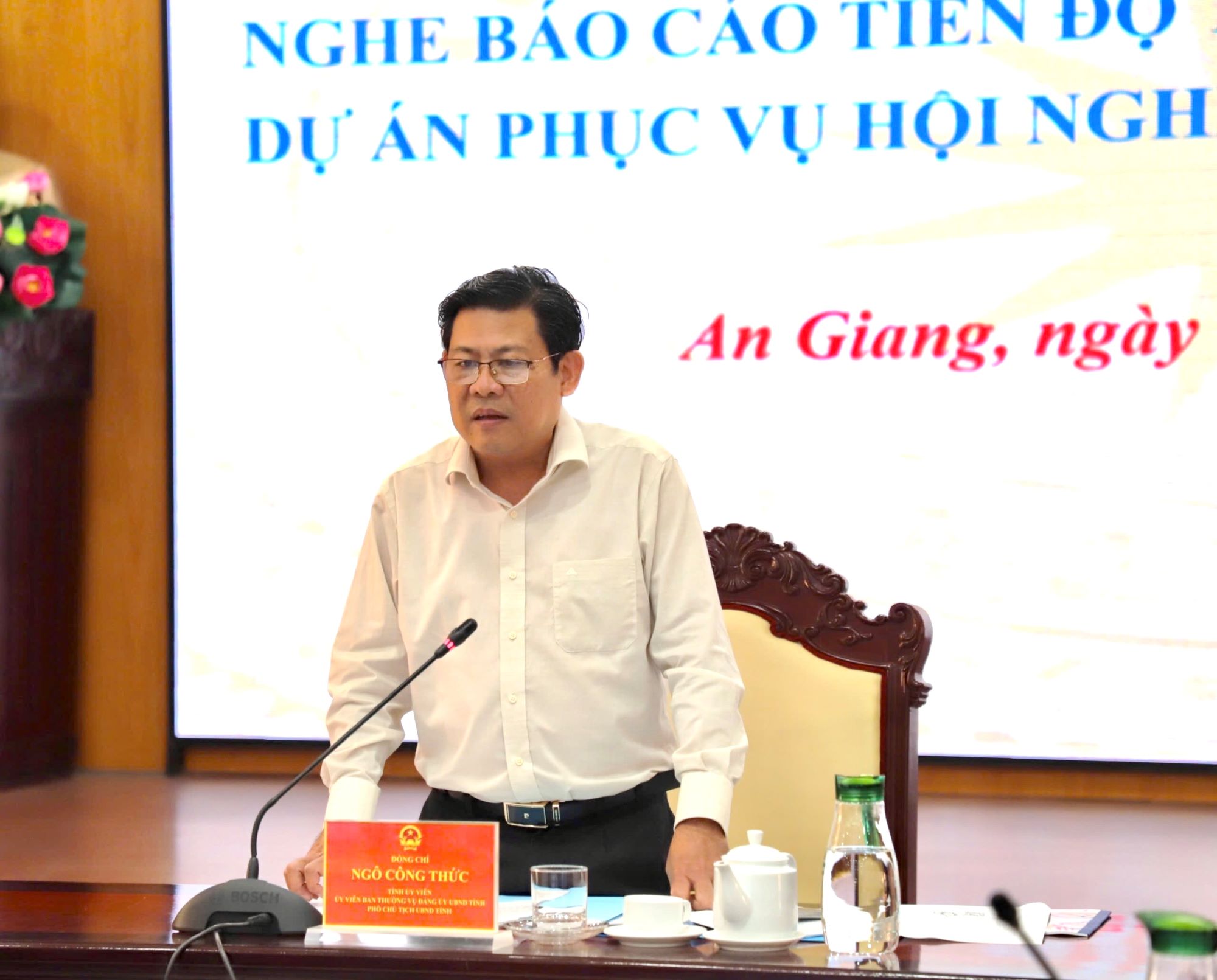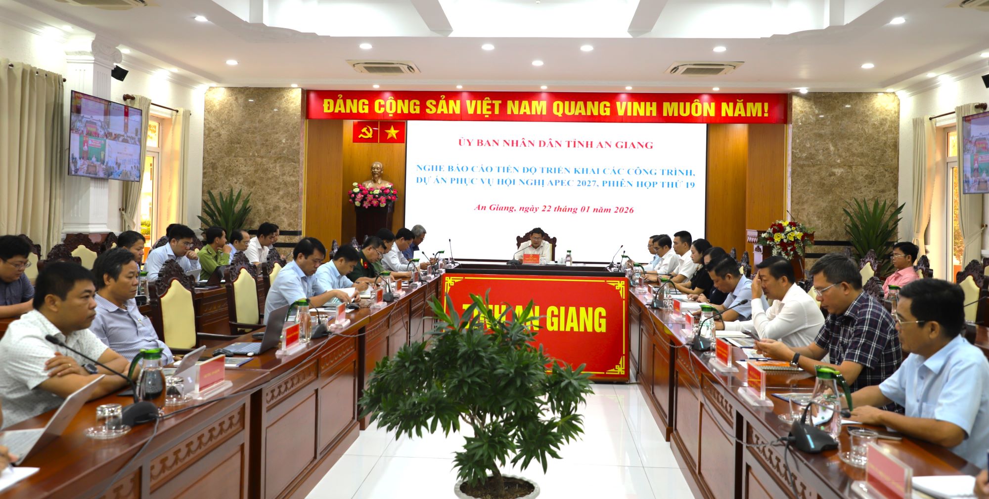 (Cổng TTĐT tỉnh AG) - Sáng ngày 22/01, Tỉnh ủy viên, Phó Chủ tịch UBND tỉnh An Giang Ngô Công Thức chủ trì cuộc họp rà soát tiến độ triển khai các Tiểu đề án và các công trình, dự án hạ tầng phục vụ Hội nghị APEC 2027. Đại diện Lãnh đạo các sở, ban, ngành liên quan; Công ty điện lực tỉnh An Giang, Tập đoàn Sun Group cùng tham dự; trực tuyến với đặc khu Phú Quốc; Ban Quản ý Khu kinh tế Phú Quốc, Vườn Quốc gia Phú Quốc.