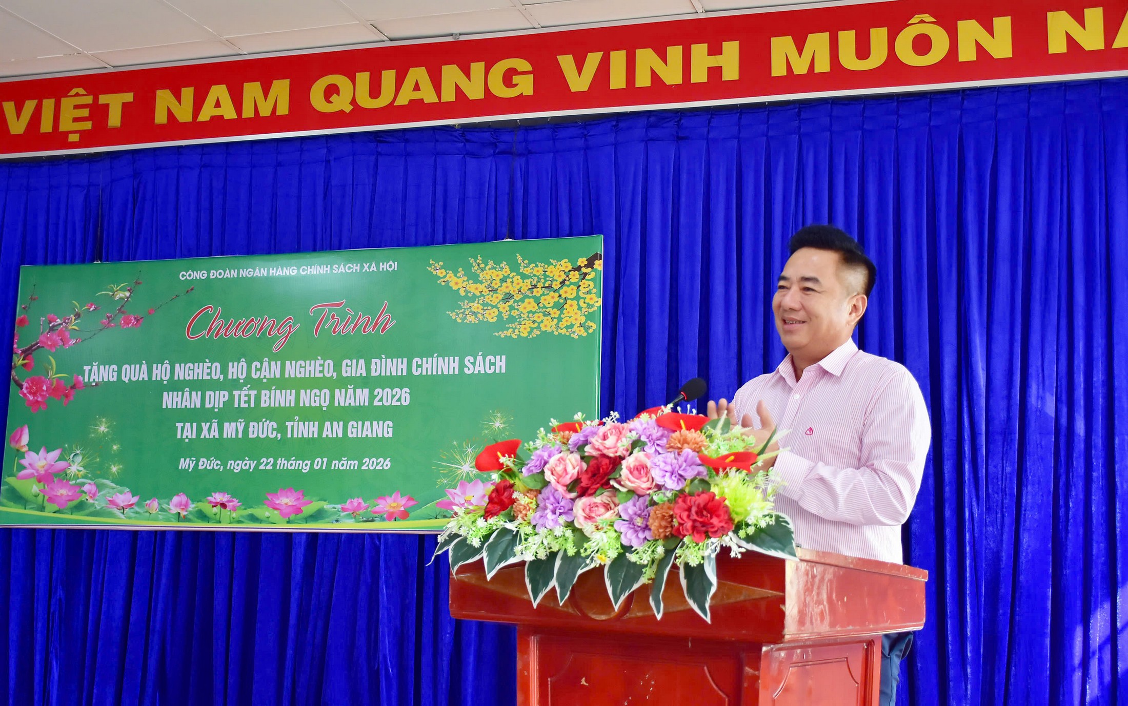 Phát biểu tại buổi trao quà, Phó Tổng giám đốc Ngân hàng Chính sách xã hội Huỳnh Văn Thuận khẳng định bên cạnh việc thực hiện tốt nhiệm vụ chính trị và chuyên môn được Đảng, Quốc hội và Chính phủ giao, Ngân hàng Chính sách xã hội luôn tích cực triển khai các hoạt động an sinh xã hội, như: Tặng quà cho gia đình chính sách, hộ nghèo nhân dịp lễ, Tết; hỗ trợ xây dựng nhà tình nghĩa; ủng hộ Quỹ “Vì người nghèo”… góp phần sẻ chia khó khăn, lan tỏa tinh thần nhân ái trong cộng đồng.
