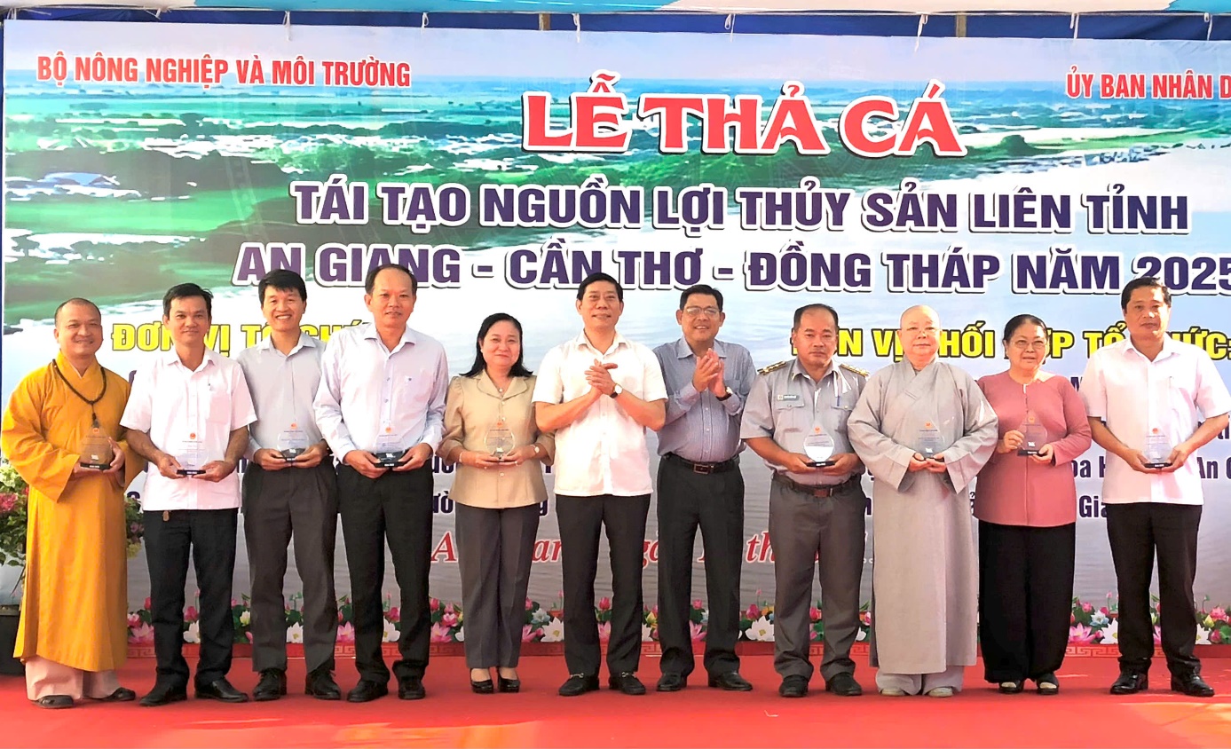 Dịp này, có 24 tập thể, cá nhân được tặng kỷ niệm chương có nhiều đóng góp tích cực trong hoạt động thả cá tái tạo nguồn lợi thủy sản liên tỉnh An Giang - Cần Thơ - Đồng Tháp giai đoạn 2022 - 2025./.