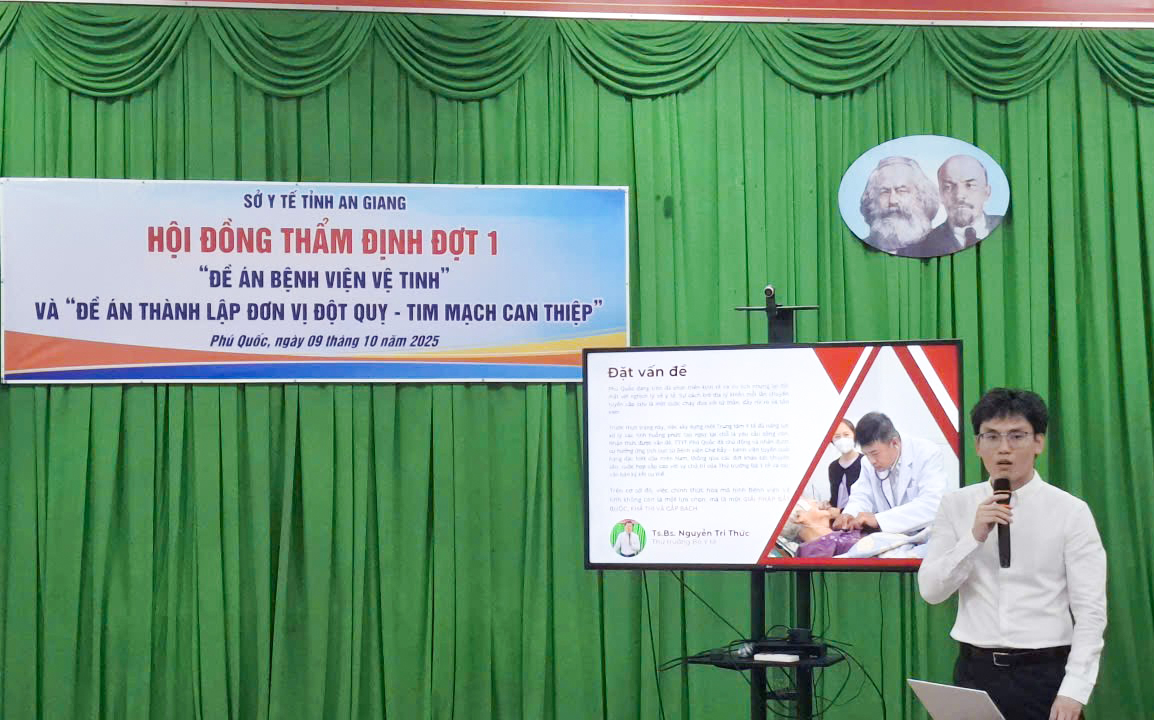 (Cổng TTĐT tỉnh AG)- Chiều 09/10, Bác sĩ chuyên khoa II Đoàn Thanh Hùng, Phó Giám đốc Sở Y tế An Giang, Phó Chủ tịch Hội đồng thẩm định đã chủ trì buổi thẩm định 2 đề án: Đơn vị Đột quỵ - tim mạch can thiệp thuộc Khoa Nội tim mạch, tại Trung tâm Y tế Phú Quốc và đề án phát triển Trung tâm Y tế Phú Quốc trở thành bệnh viện vệ tinh của Bệnh viện Chợ Rẫy giai đoạn 2025 - 2030 (đợt 1).