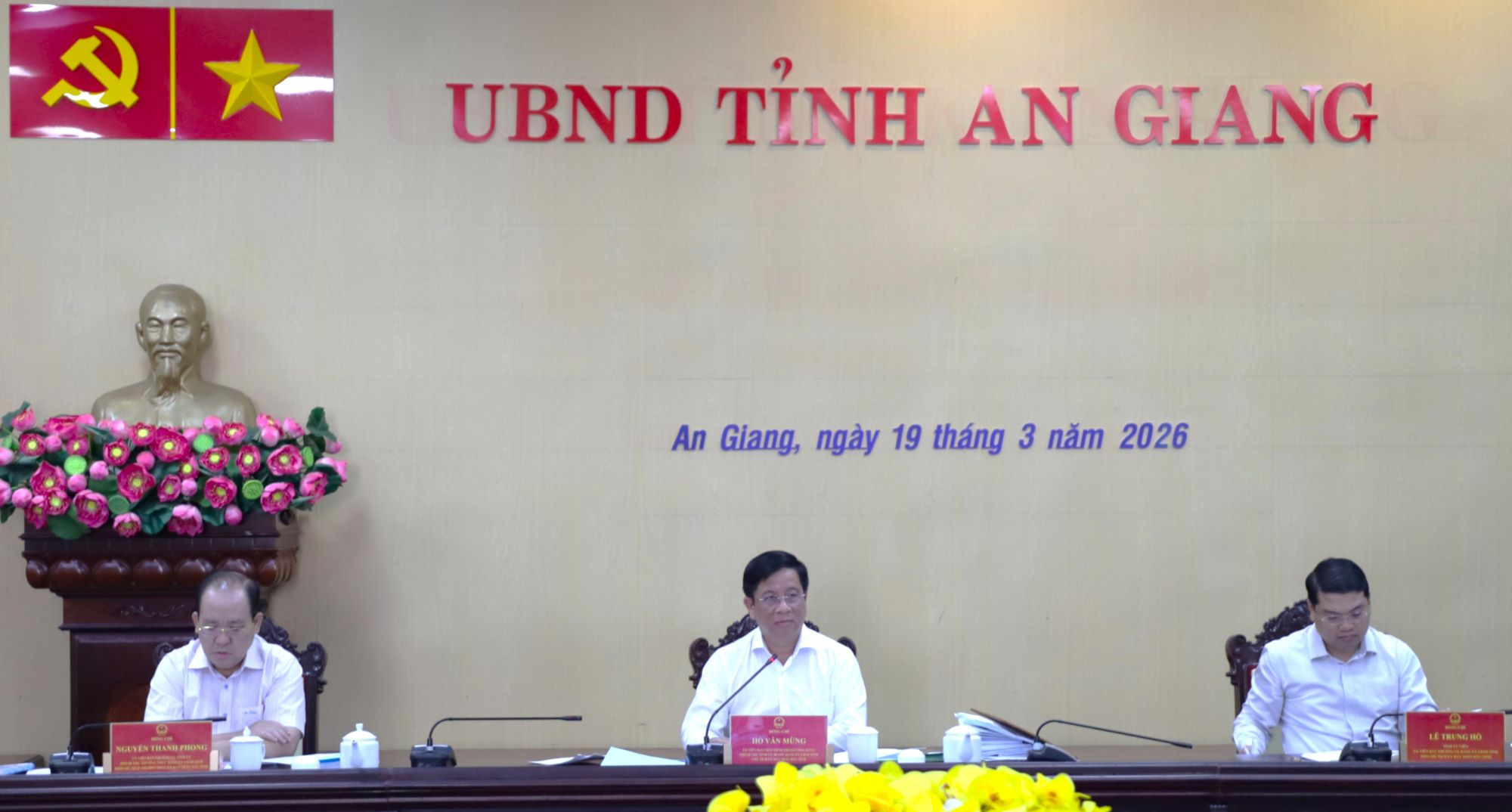 (Cổng TTĐT tỉnh AG) - Chiều ngày 19/3, Ủy viên Ban Chấp hành Trung ương Đảng, Phó Bí thư Tỉnh ủy, Chủ tịch UBND tỉnh An Giang Hồ Văn Mừng chủ trì cuộc họp chuyên đề Thành viên UBND tỉnh thông qua các nội dung thuộc thẩm quyền quyết và trình Ban Thường vụ Đảng UBND tỉnh. Cùng tham dự có Phó Chủ tịch Thường trực UBND tỉnh Nguyễn Thanh Phong; Phó Chủ tịch UBND tỉnh Lê Trung Hồ; tại điểm cầu phường Long Xuyên, có Phó Chủ tịch UBND tỉnh Ngô Công Thức; đại diện Lãnh đạo các sở, ban, ngành liên quan cùng tham dự; trực tuyến với các xã, phường, đặc khu: Rạch Giá, Phú Quốc, Châu Thành, Vĩnh Hậu, An Châu, Châu Đốc, Vĩnh Thạnh Trung, Vĩnh Thông, Kiên Lương, Long Xuyên, Mỹ Thới, Bình Đức, Tiên Hải, Giang Thành, Bình An, Châu Phú, Óc Eo, An Minh.